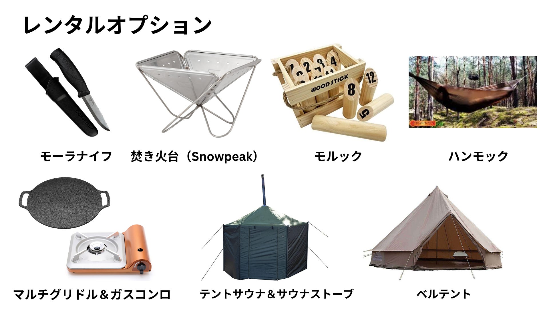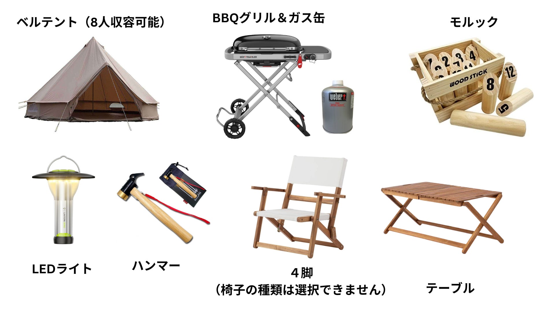 含まれるもの:デイキャンプサイト利用料、ベルテント(8人収容可能)、BBQグリル(ガス缶も含まれています)、椅子4脚、LEDライト、テーブル、モルック、ハンマー