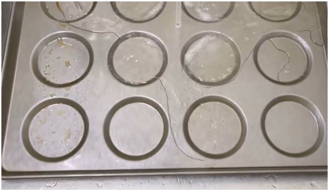 通常、離型油はその名の通り油になじみやすい性質を持っていますが、「離型油すすげるん」は油ではなく水になじみやすいという特長があります。そのため洗剤を使用せずとも、熱水ですすぐだけで簡単に汚れを落とすことができます(特許出願中)。