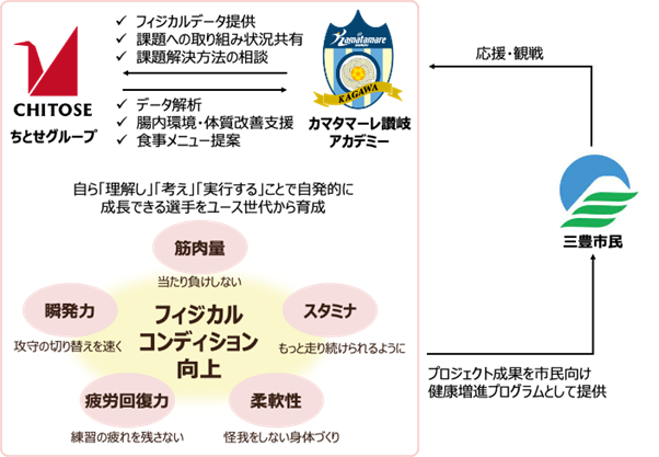 本取り組みを通じて、カマタマーレ讃岐のチーム強化に繋げるのみならず、その成果をレポートや記事にまとめてカマタマーレ讃岐の公式SNSなどで公開・発信することで、チームとファンの交流機会を広げるとともに、腸内環境から健康増進に取り組む重要性の認知を拡大して行きます。さらに、ちとせグループと三豊市との包括連携協定(2021年5月31日発表)および、現在計画中の三豊市宝山湖ボールパーク構想に基づき、カマタマーレ讃岐が中心となって推進する地域住民の皆様向けの様々な健康増進プログラムの提供に発展させていくことを期待しています。