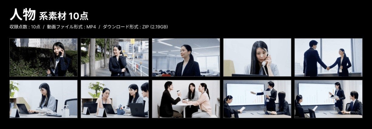 今回、2024年4月1日から4月30日まで期間限定で「CG系素材」「人物系素材」「景観系素材」計3種の映像素材が販売され、当社は、映像素材の提供企業として、30秒程度のオフィス風景や動画編集用のCG素材などを提供いたしました。