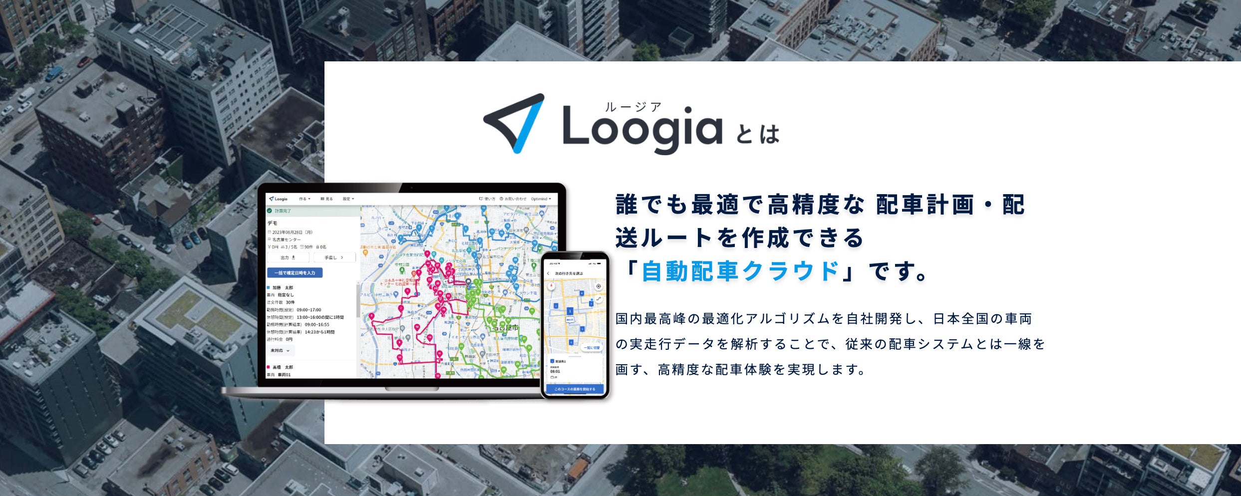 Loogiaは、ラストワンマイル配送におけるルート最適化クラウドサービスです。「どの車両が、どの訪問先を、どの順に回るか」という配送計画を、配送先の時間指定などのラストワンマイルならではの40以上の現場制約や収集したGPSデータを解析することで得られた走行速度や駐車位置を加味して提案します。佐川急便社、日本郵便社やローソン社など幅広い業界に延べ190社以上にサービス展開をしています。