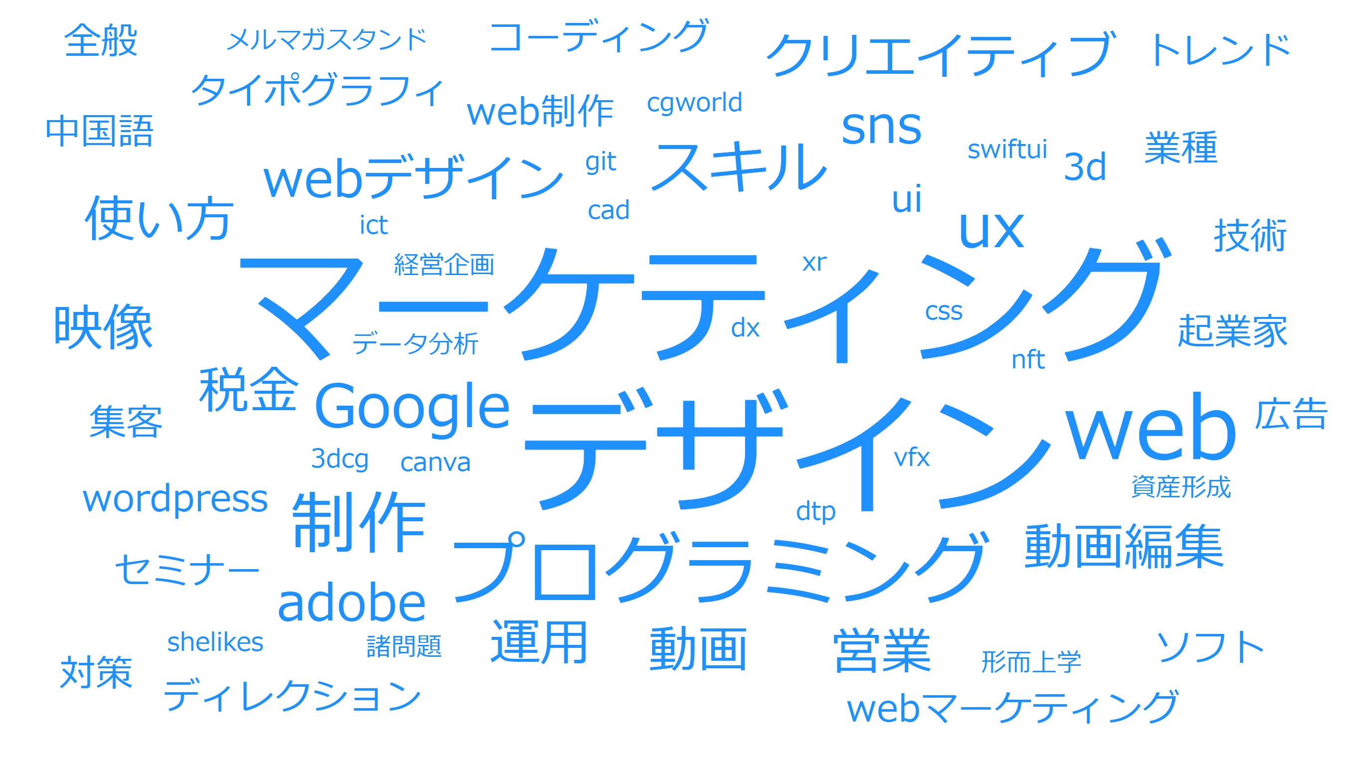 なかでも、「グラフィックデザイナーがWebデザインするときに気をつけるポイント」や「最新のUIデザイン」「コーダーが理解しやすいデザインの作り方」について学んでいるという声もあり、WordPress、コーディング、 GIT、Unity,プログラミング、 Googleトレンド などWeb関連の回答が多く、Webへの興味関心が高いことが伺えます。