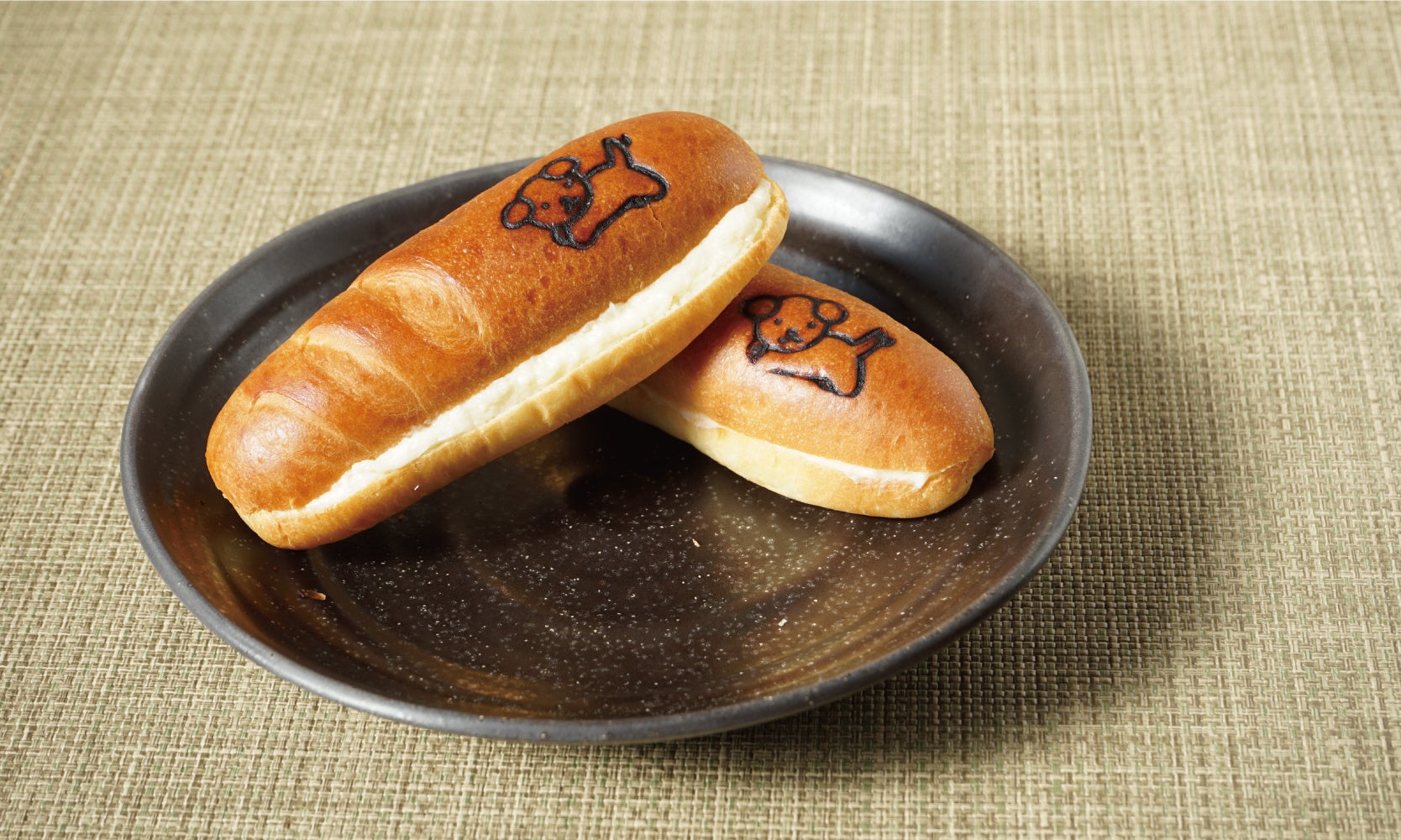 ソフトフランスパンに練乳クリームを挟んだ、昔ながらのおやつパンです。片方にはいったクープも可愛らしく、おやつ堂限定パンのしるしに、スナッフィーの焼き印がついています。