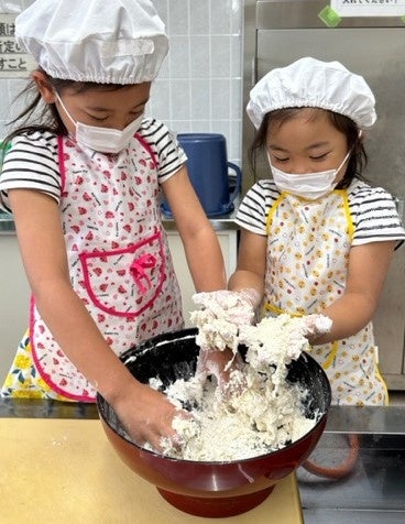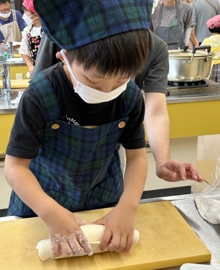 社高校生活科学科の課題研究の授業で「地方創生」を選考する生徒たち(以下、地方創生班)が、地元産のもち麦を活用して「地域を元気にする活動」を始めて、今年で5年目になります。地方創生班の活動は、もち麦を使った商品開発から、イベントの企画・運営まで多岐に渡ります。この日は、地元の製麺業遠藤コンス株式会社(加東市上滝野)の齋藤さんと共に、もち麦うどん打ちの先生として子どもたちの前でデモンストレーションを行いました。加東市では、「もち麦うどん打ち体験」を行う度に地方創生班の3年生が代々先生となって子どもたちを楽しませており、人気のイベントとして定着しつつあります。