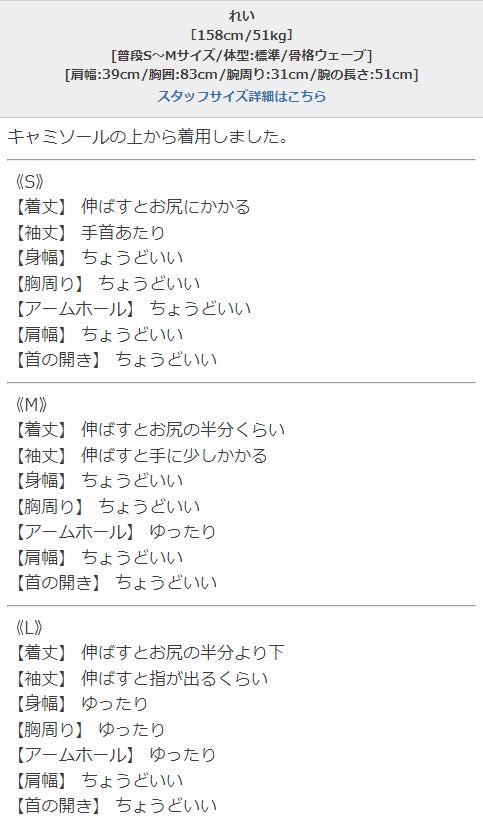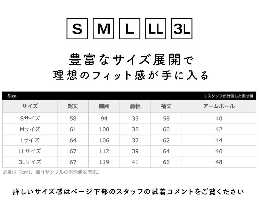 なお、公式オンラインショップでは、当社スタッフが試着した際のコメントを紹介。身長や体型、骨格などが細かく記載しており、それぞれのサイズ感をわかりやすくお伝えしています。