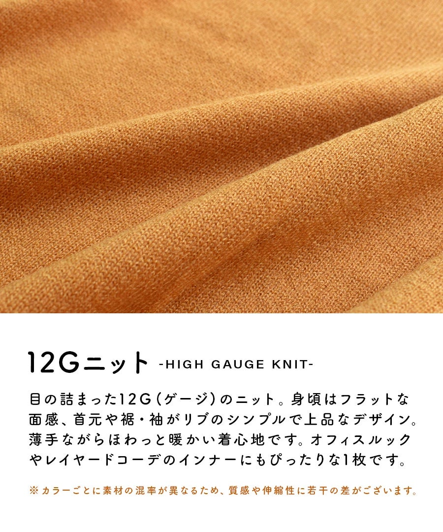 「12Gベーシックニット」は、その名の通り12Gの編み目の詰まったハイゲージニットです。シンプルでキレイめな印象であり、オフィスルックからレイヤードコーディネートのインナーにもぴったり。