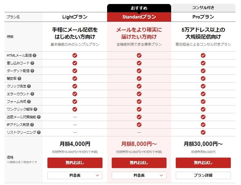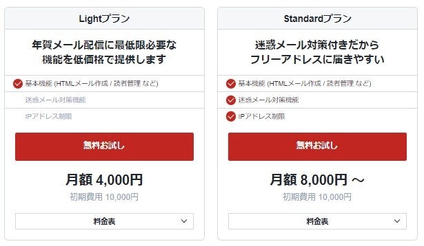 料金プランは業界最安クラス。年賀メール用のスポットとして利用しやすいよう月額4,000円から使える(Lightプランの場合)料金設定となっています。※最低契約期間:3ヶ月