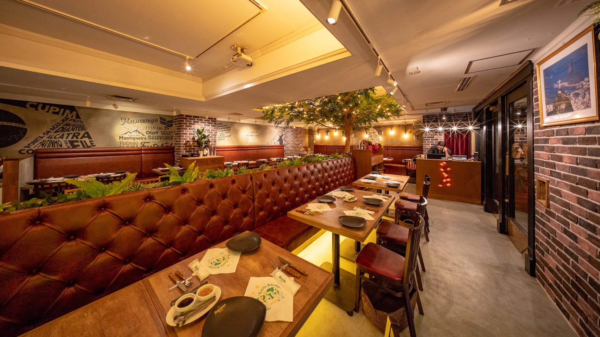 店内は、中央にある大きな植栽や壁画でブラジルの豊かな自然や陽気な雰囲気を演出。ソファー席をメインに配し、お子様連れのファミリーやデート、友人、職場の仲間など、あらゆる世代のお客様に様々なシーンでご利用いただいています。