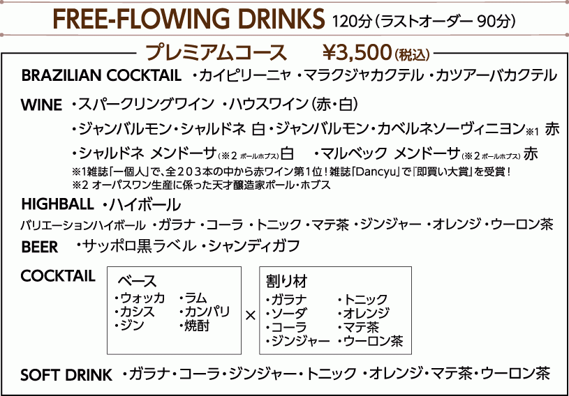 ◆ディナータイムこだわり牛シュラスコ22種、特選ワインやブラジリアンカクテルが入った、プレミアム飲み放題付き12,000円 → 10,000円。