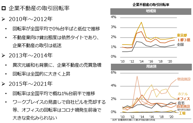 - ワークプレイスの見直しで自社ビルを売却する等、オフィスの回転率はコロナ禍発生前後で大きな変化みられない