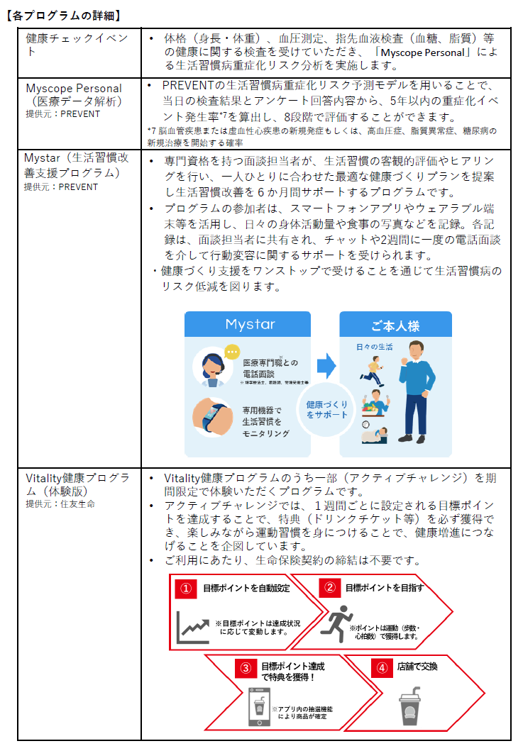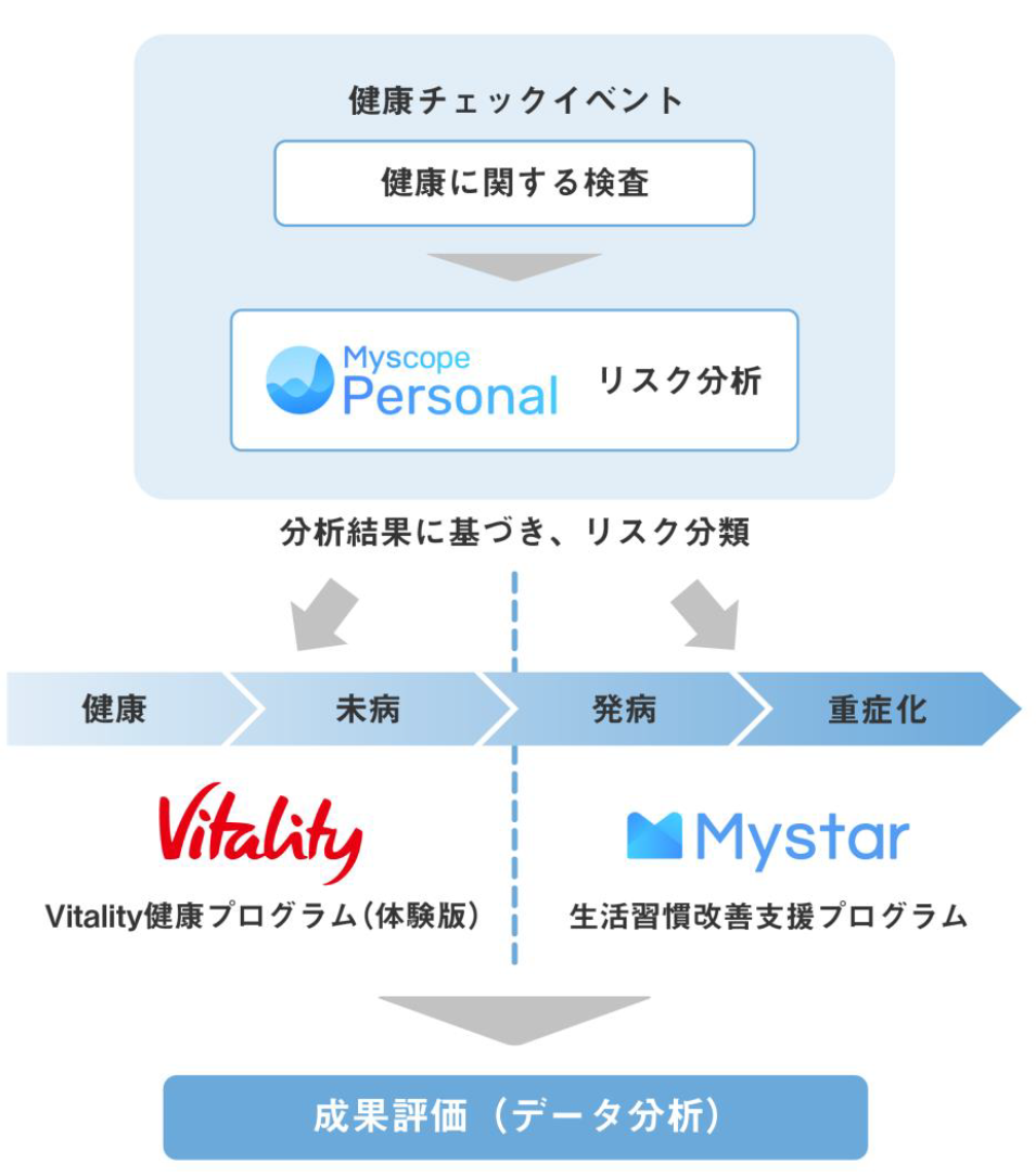 そこで、住友生命が提供する健康増進型保険“住友生命「Vitality」”の健康プログラムと、PREVENTが新たに開発した医療データ解析「Myscope Personal」および生活習慣改善支援プログラム「Mystar」を活用することで、特定健康診査の受診率向上、生活習慣病の発病や重症化の予防、健康増進活動によるQOLの維持・向上を目指します。
