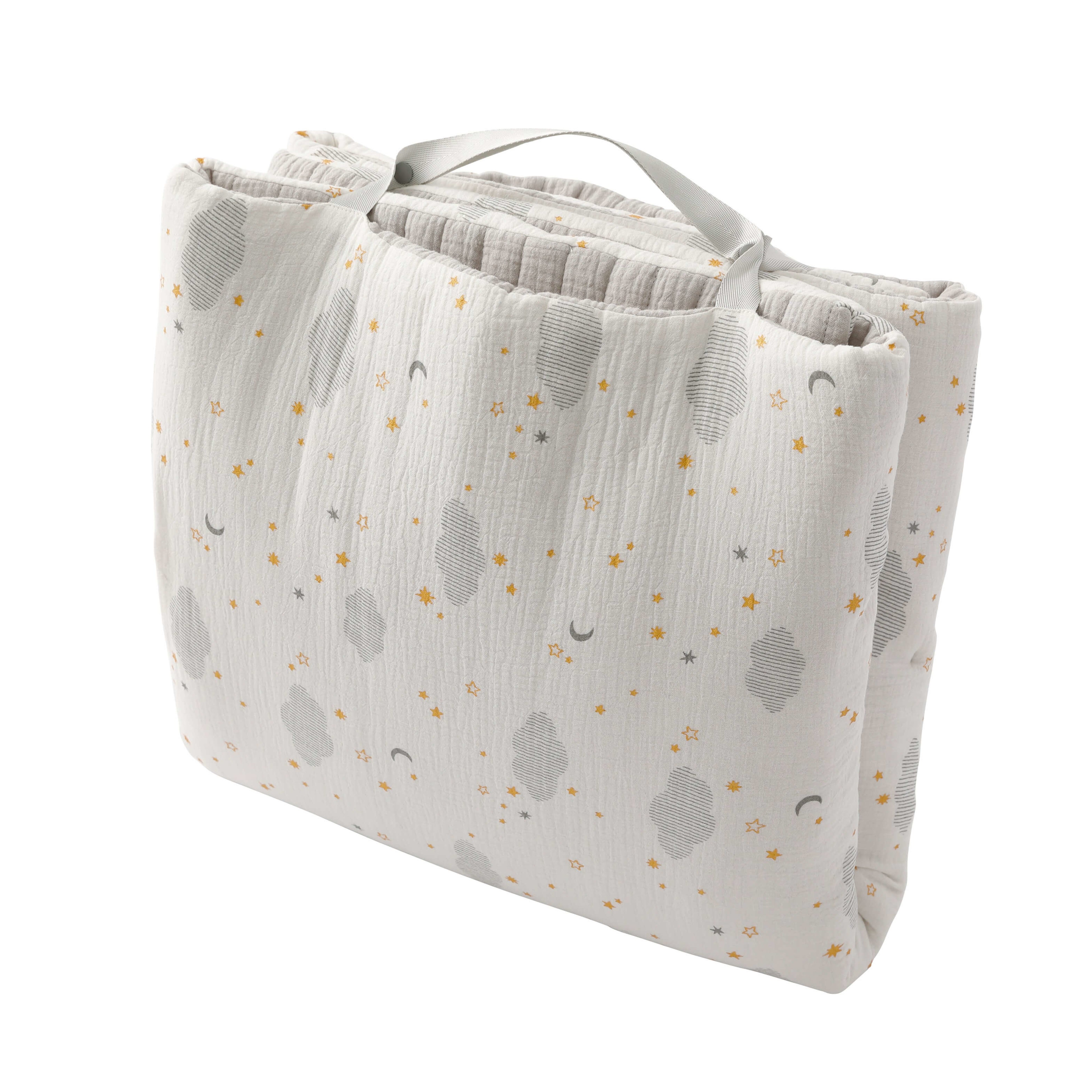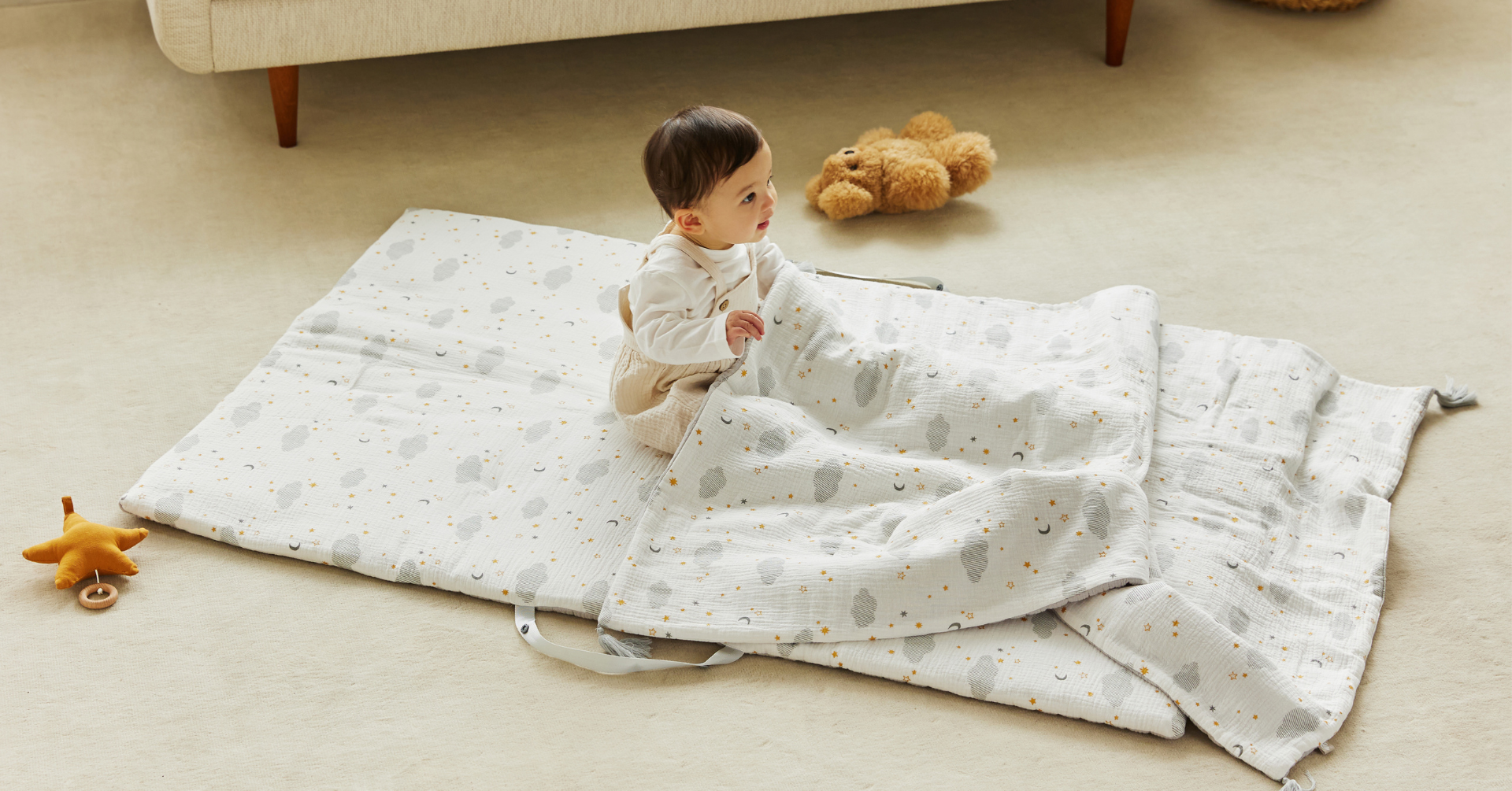お昼寝マットは約80×125cmで、プレイマットとしても使用できるゆったりサイズです。取っ手がついているので持ち運びに便利。内側にガーゼケットを挟んで畳むこともでき、帰省先や友人宅などでのお昼寝にもおすすめです。