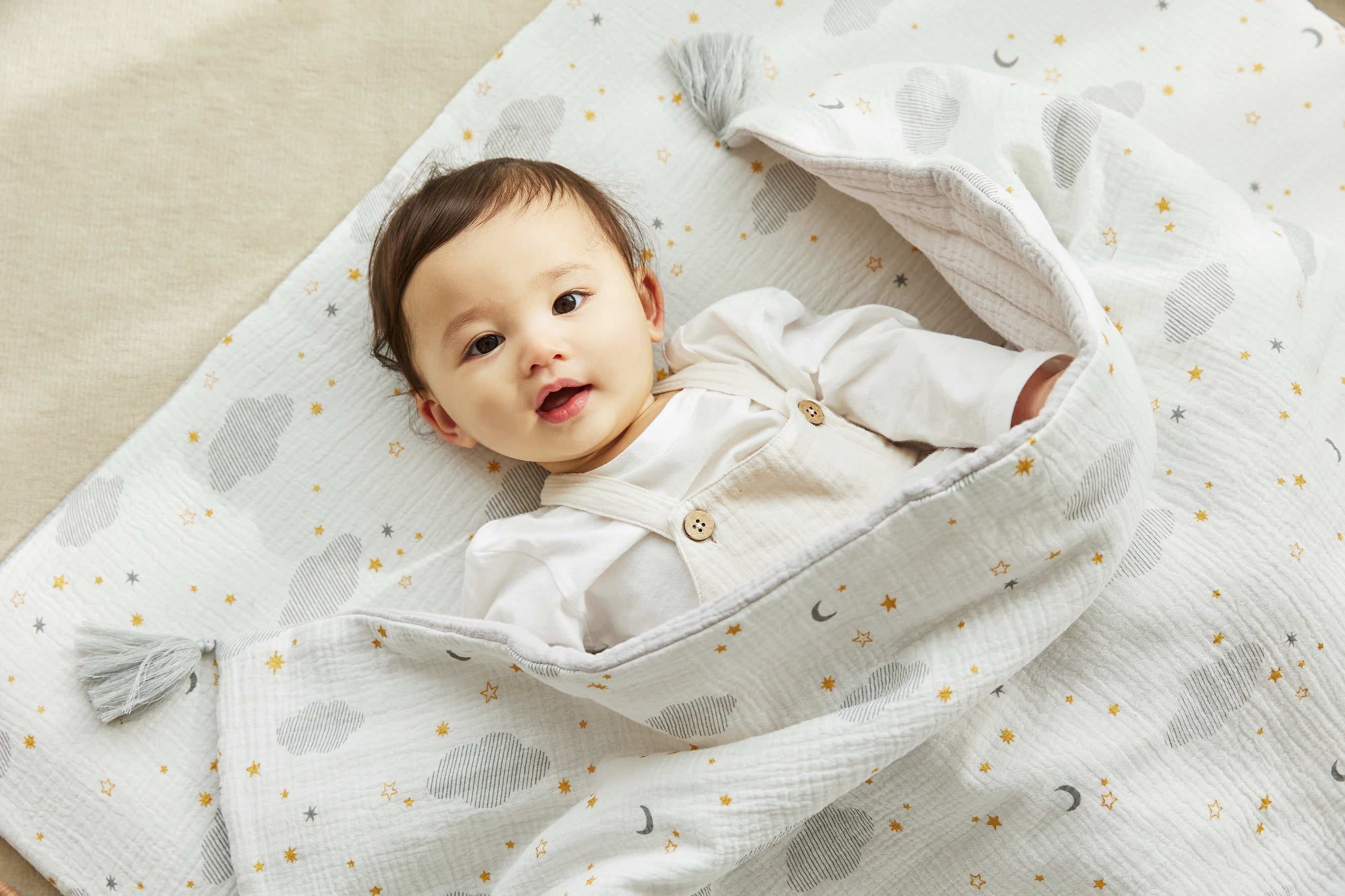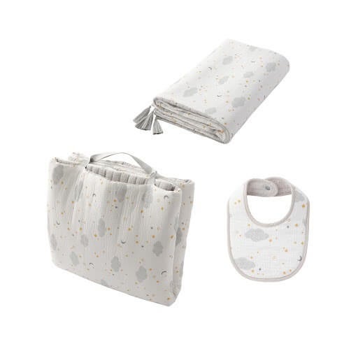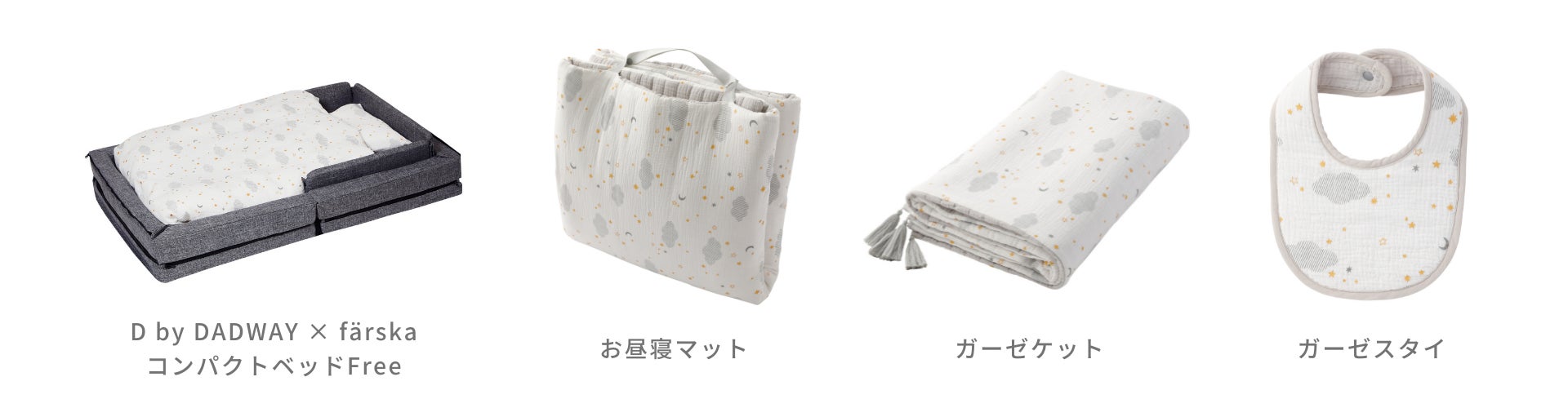 お昼寝マット、ガーゼケット、ガーゼスタイのお得な3点セットを数量限定でご用意しました。「ドリーミングスター」のテキスタイルをお揃いでお楽しみいただけます。