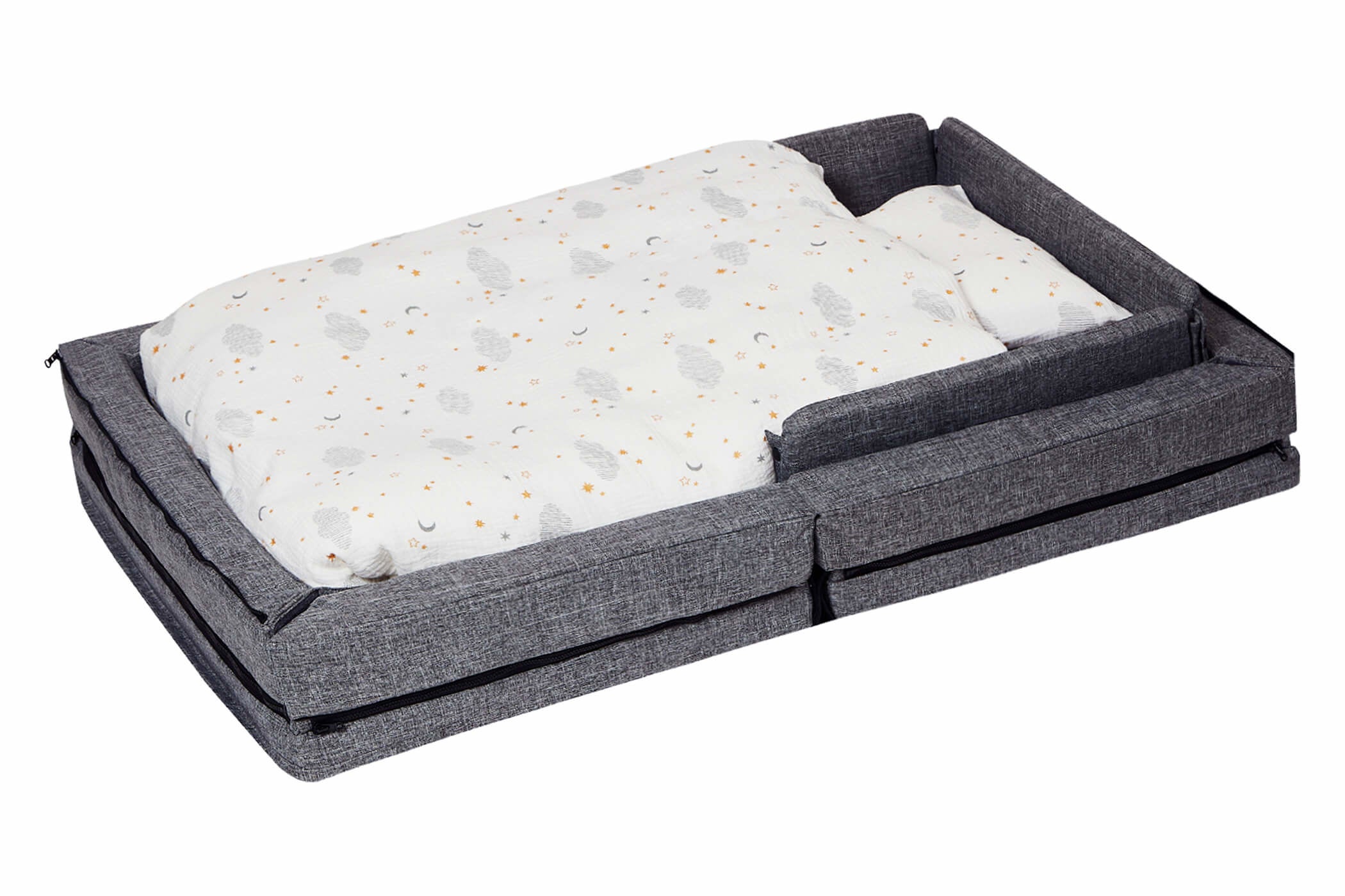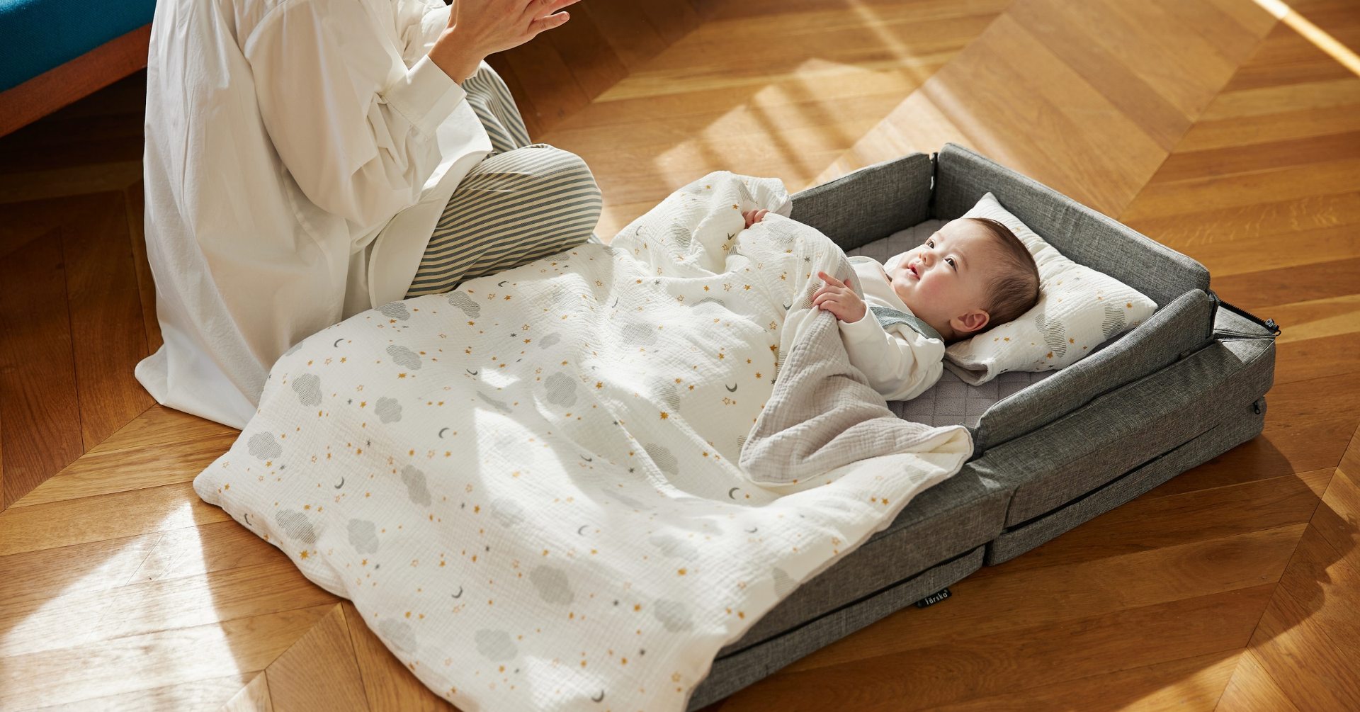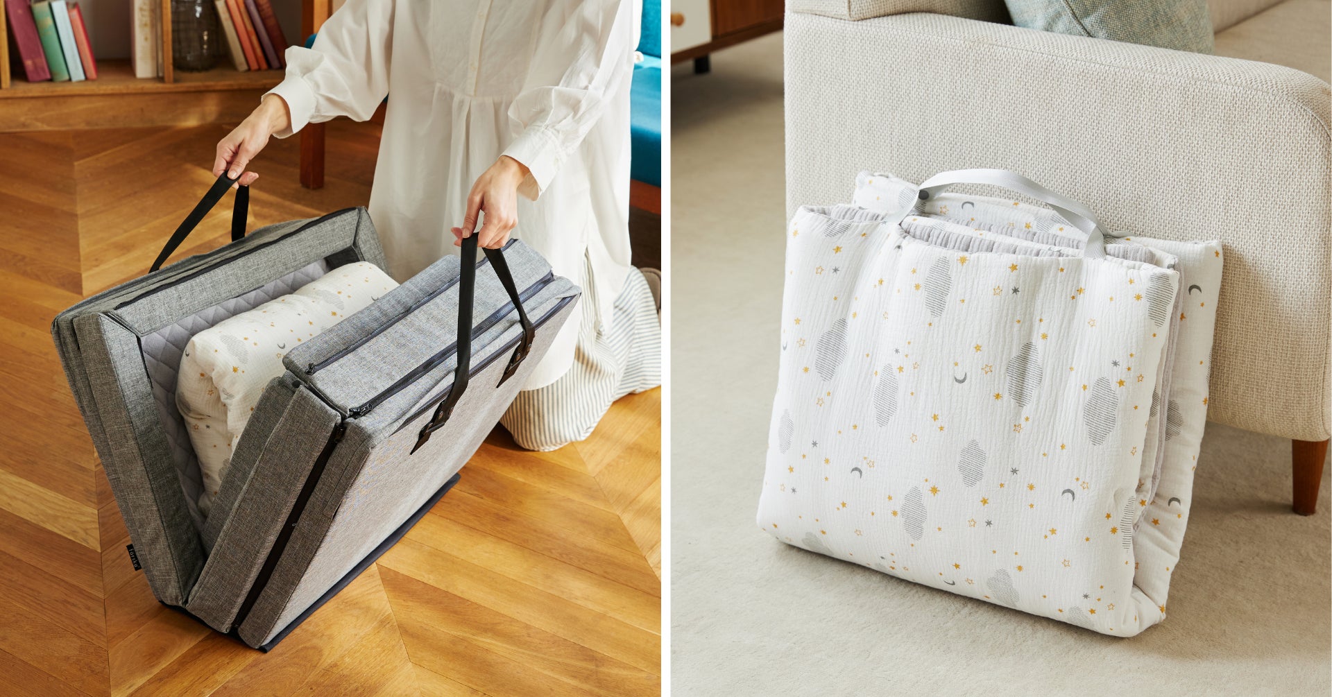 コンパクトベッドFreeは、折りたたんで持ち運べるベビーベッドです。ふとんやまくら等の寝具をベッドの中に入れて収納できるため、サッと広げるだけで寝んねスペースが完成。お子さまの成長や育児のシチュエーションに合わせて、5つのモードに形を変えながらお使いいただけます。