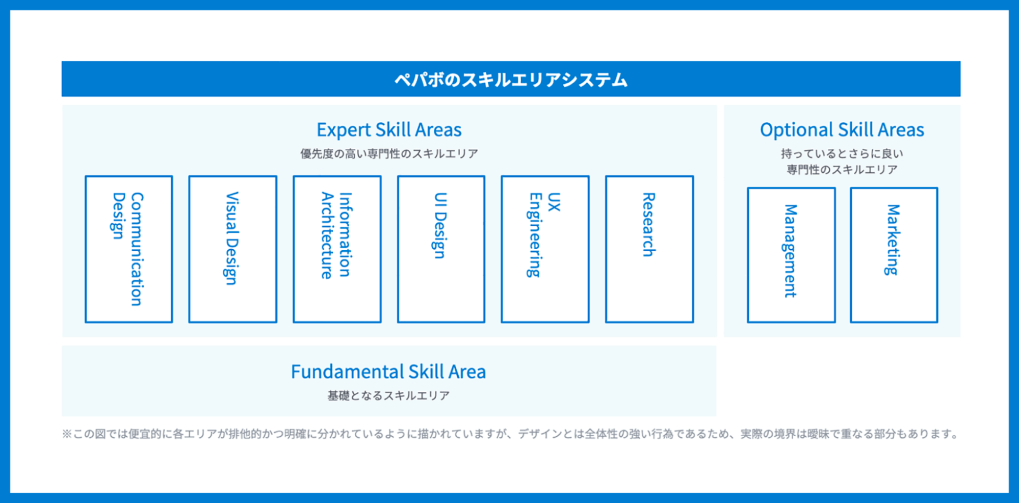 デザインする対象とそれらの構造を言語化した「ペパボデザインスキーム」、デザイナーの専門性を言語化した「スキルエリアシステム」、意思決定のための判断基準となる「デザインプリンシプル」など、デザイン組織の原則を共通言語として浸透させることで、各事業部のデザイナーが事業成長につながる価値を発揮しやすい組織づくりを行っています。