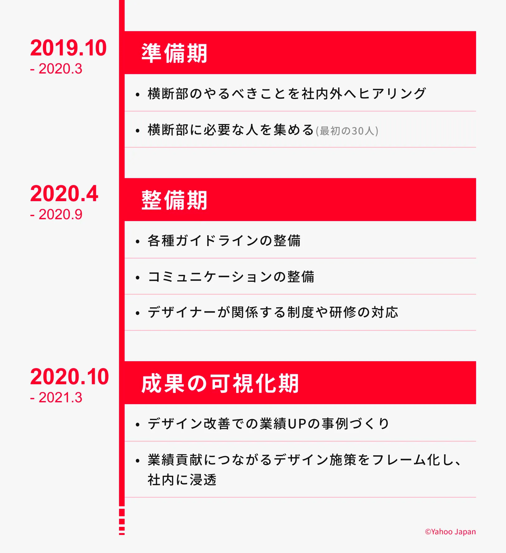 ヤフーのデザイン横断部から、450名を超えるデザイン横断組織の立ち上げにおける、準備、体制の整備、成果の可視化の3ステップで行ったことが事例として公開されました。