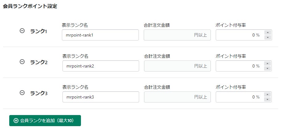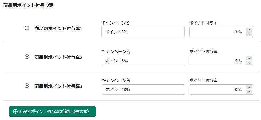 商品別のポイント付与率設定が、3種類まで設定可能でしたが、今回のアップデートで10種類まで同時設定が可能になりました。
