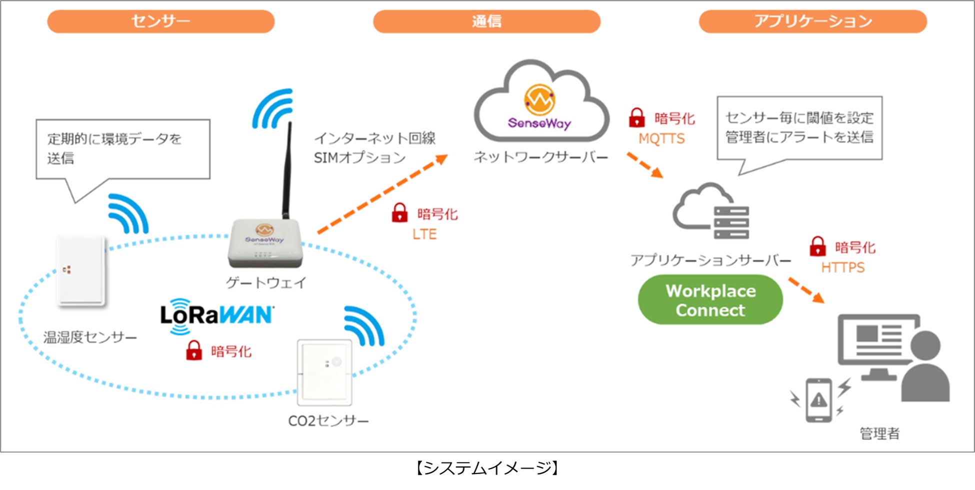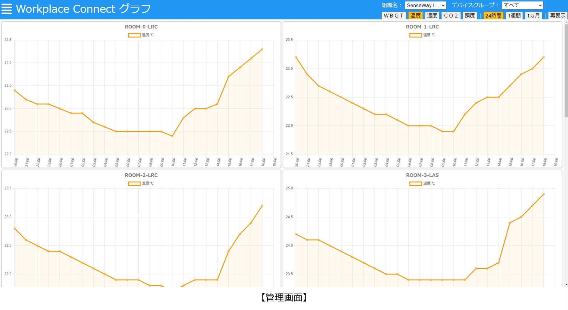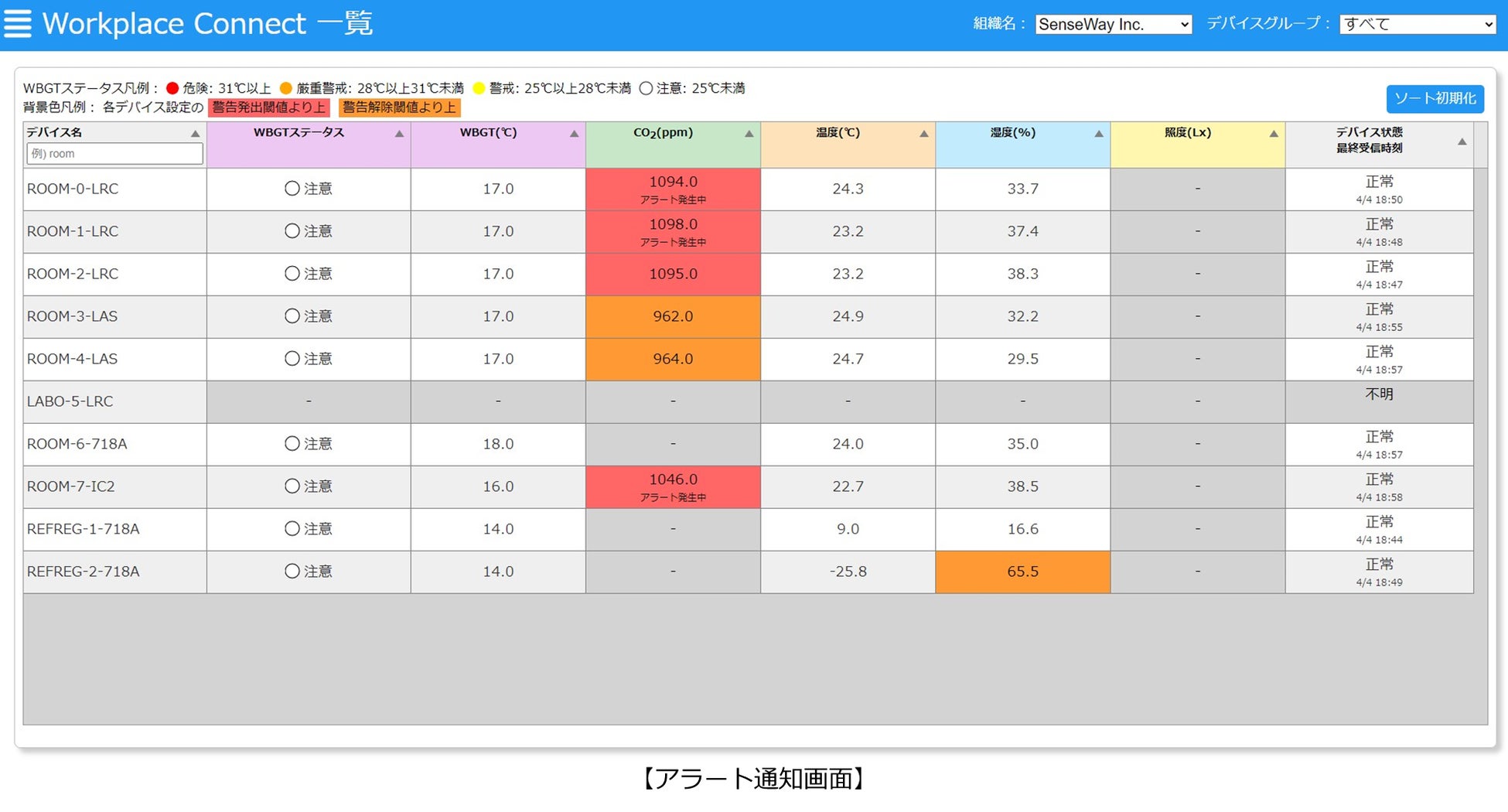 そこで、センスウェイでは、物流施設やオフィスなどの屋内環境を一元管理できるシステム「ワークプレイス・コネクト」を開発しました。本サービスは、温度湿度センサーやCO2センサーなどにより環境データを集計、グラフ化し、現場の状況を一目で把握することができます。また、アラート通知機能により、温度や湿度、WBGT値などが異常値を計測した場合は、管理者にメール通知を送信します。これによって、熱中症の対策や従業員の安全管理を遠隔で素早く行えます。
