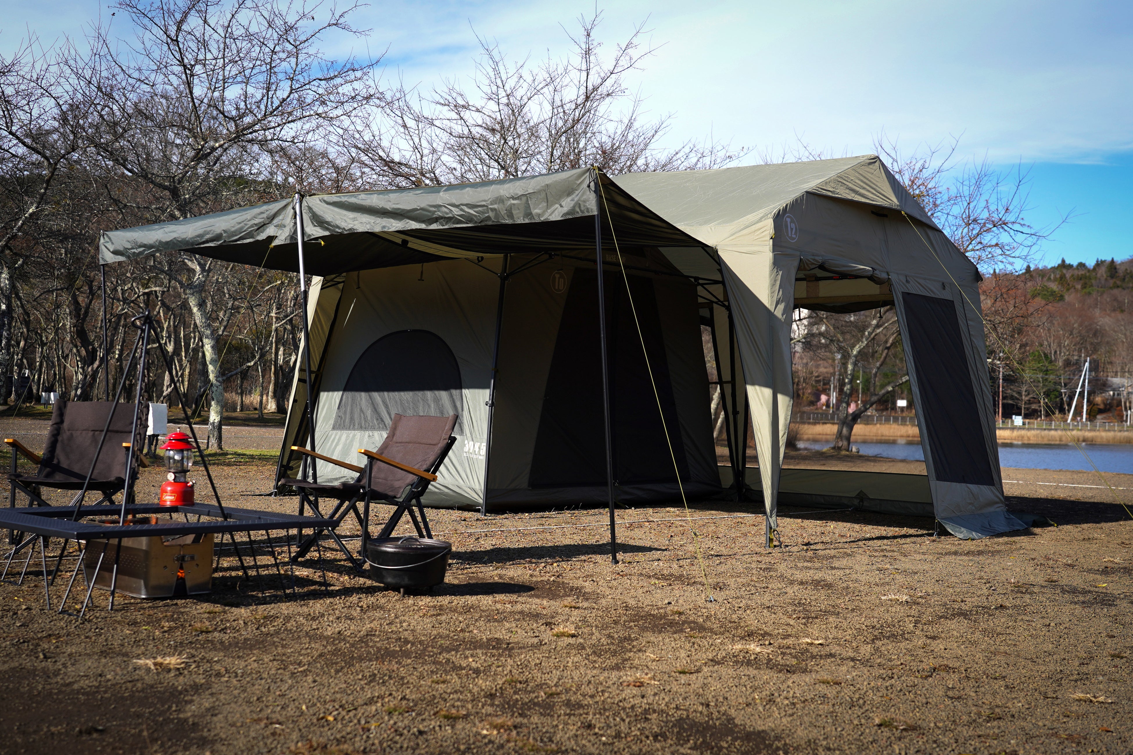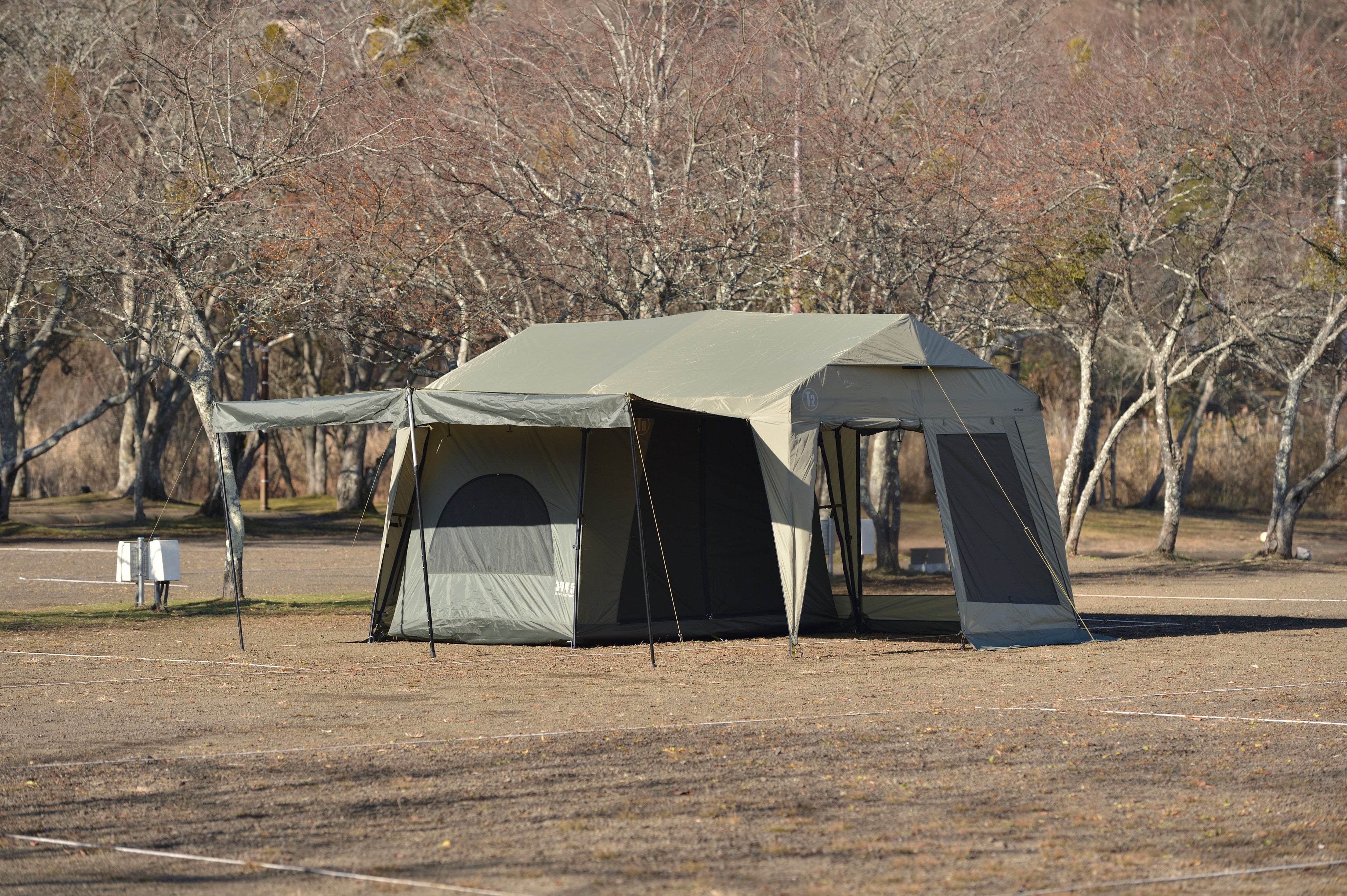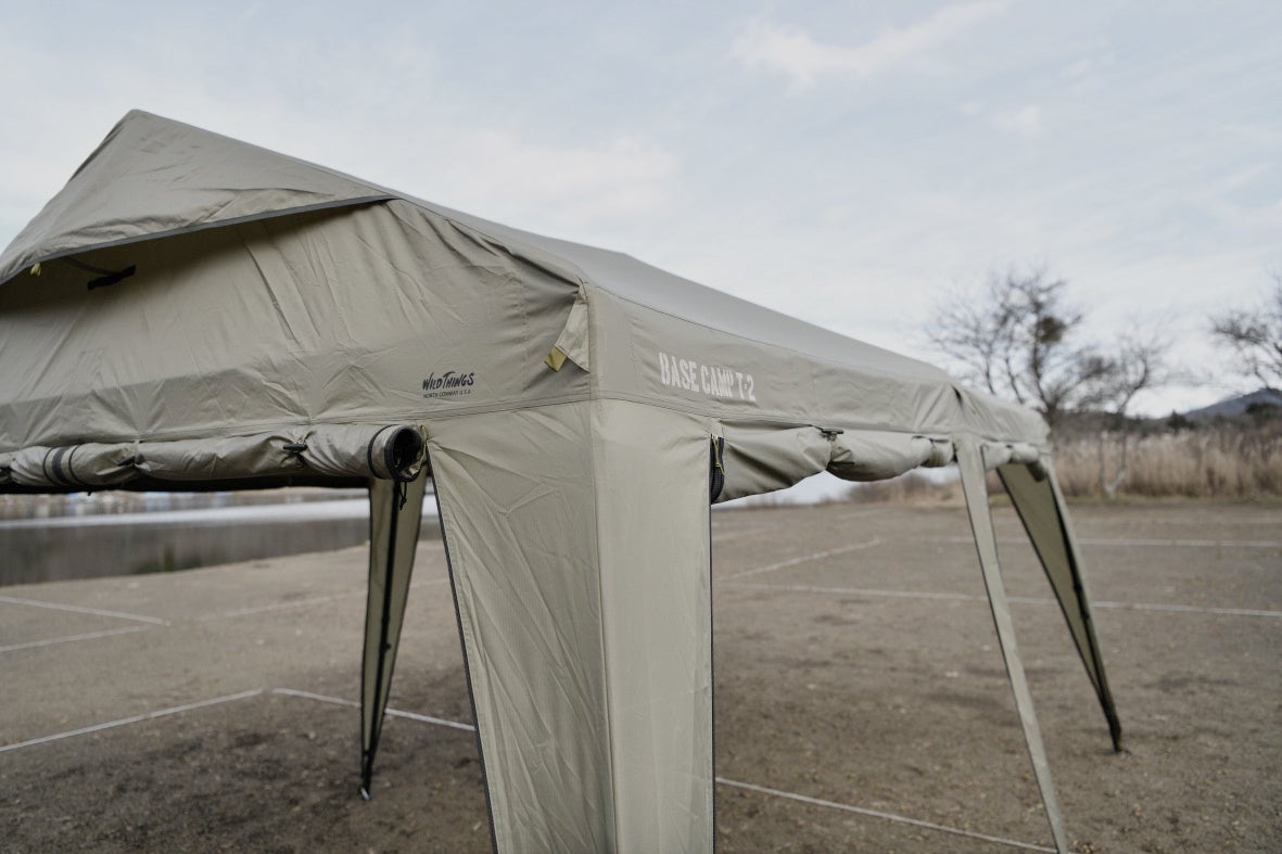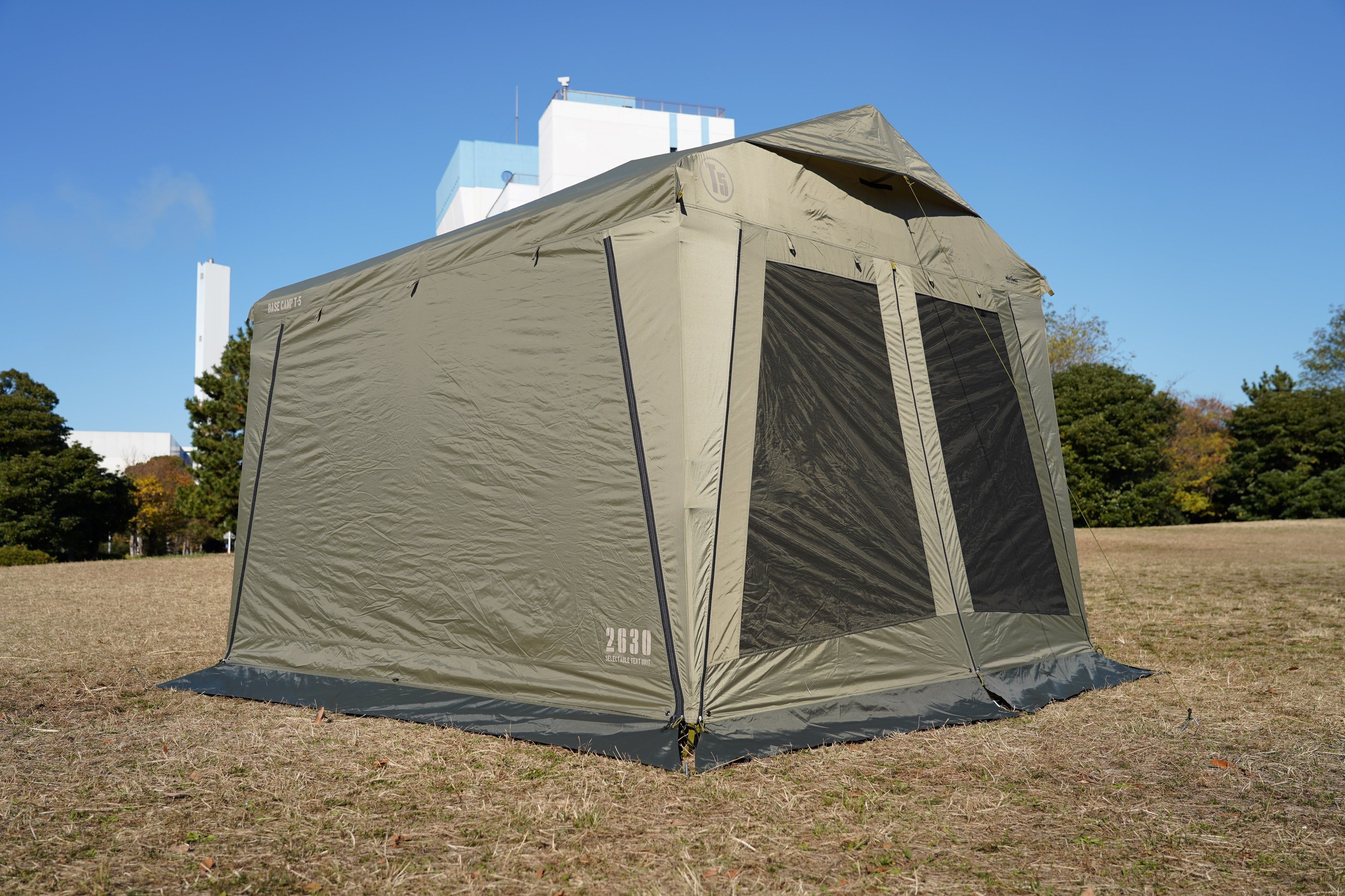 初登場。BASE CAMP T-2と品質は同じく、4面フルメッシュにもフルオープンにもなる、色々な可能性を秘めたキャビン型テント。