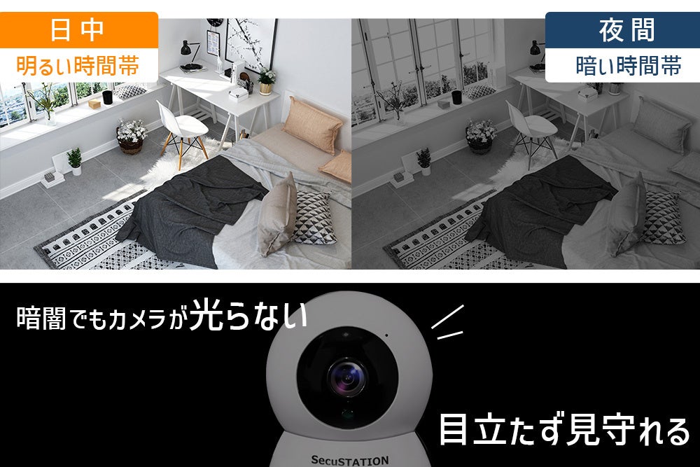 暗闇を照らす赤外線ライトには不可視赤外線を採用。暗闇でも赤く光らないから、お子様やペットにストレスを与ることもなく、せっかく寝かしつけたお子様の睡眠を妨げることもありません。