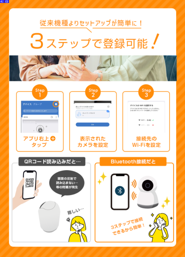従来機種は、スマートフォンに表示されたQRコードをカメラに読み取らせる操作が必要でしたが、周囲の明るさや画面の明るさ等、条件によっては読み込みづらい、設定が難しく感じるという問題がありました。