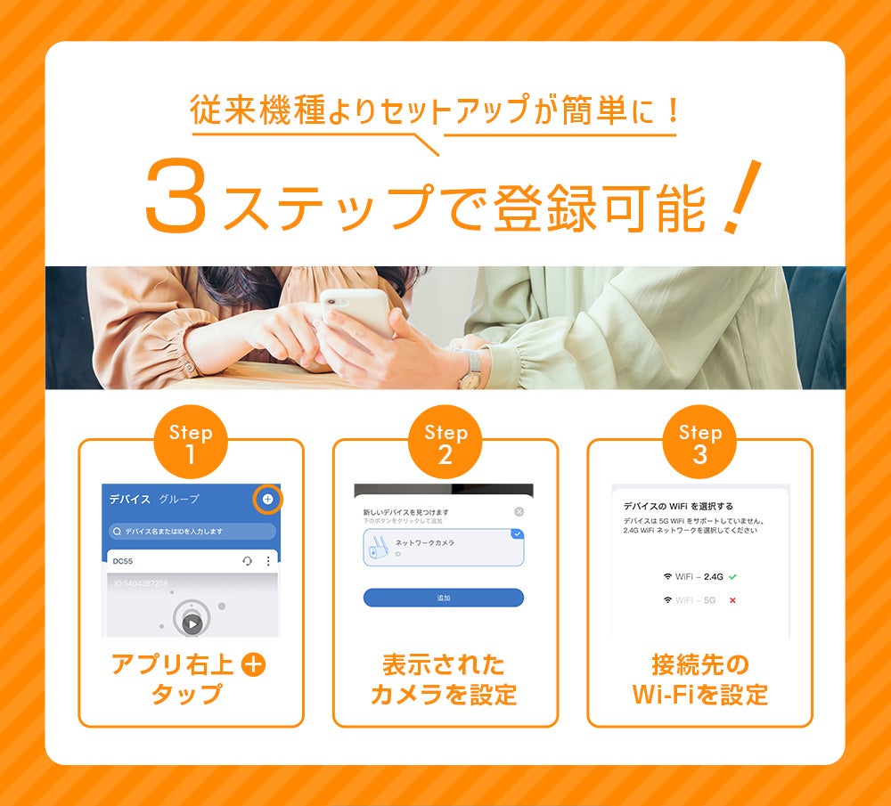 当機種は、Bluetooth接続により、カメラとスマートフォンが直接電波で繋がり設定ができるため、設定が失敗しにくくなり、簡単・スピーディーに設定することができます。