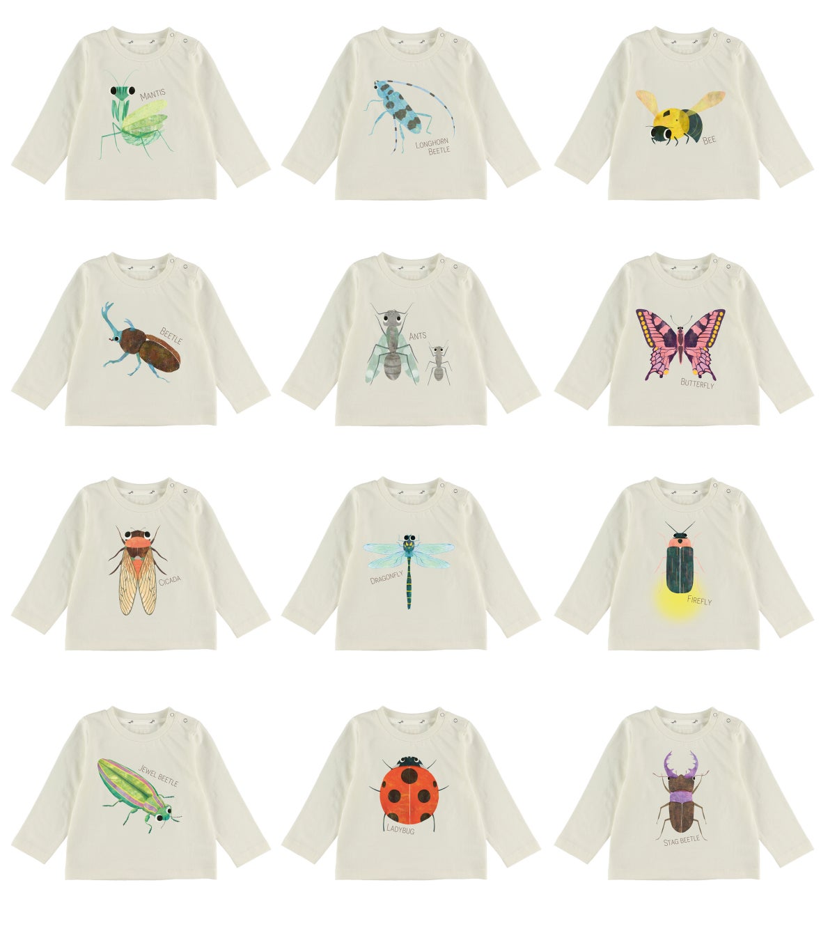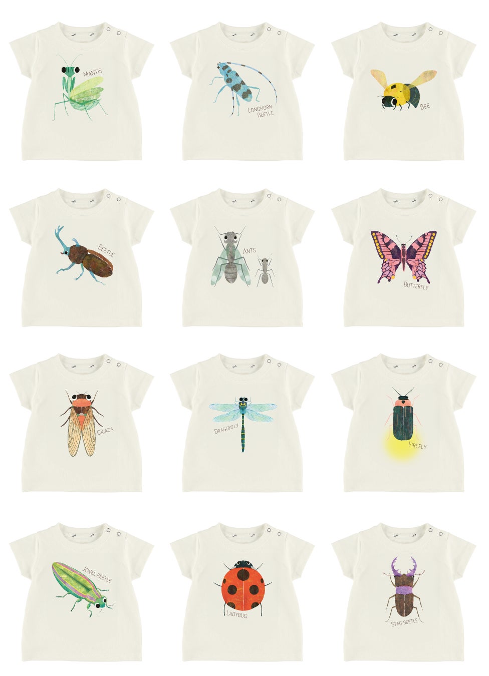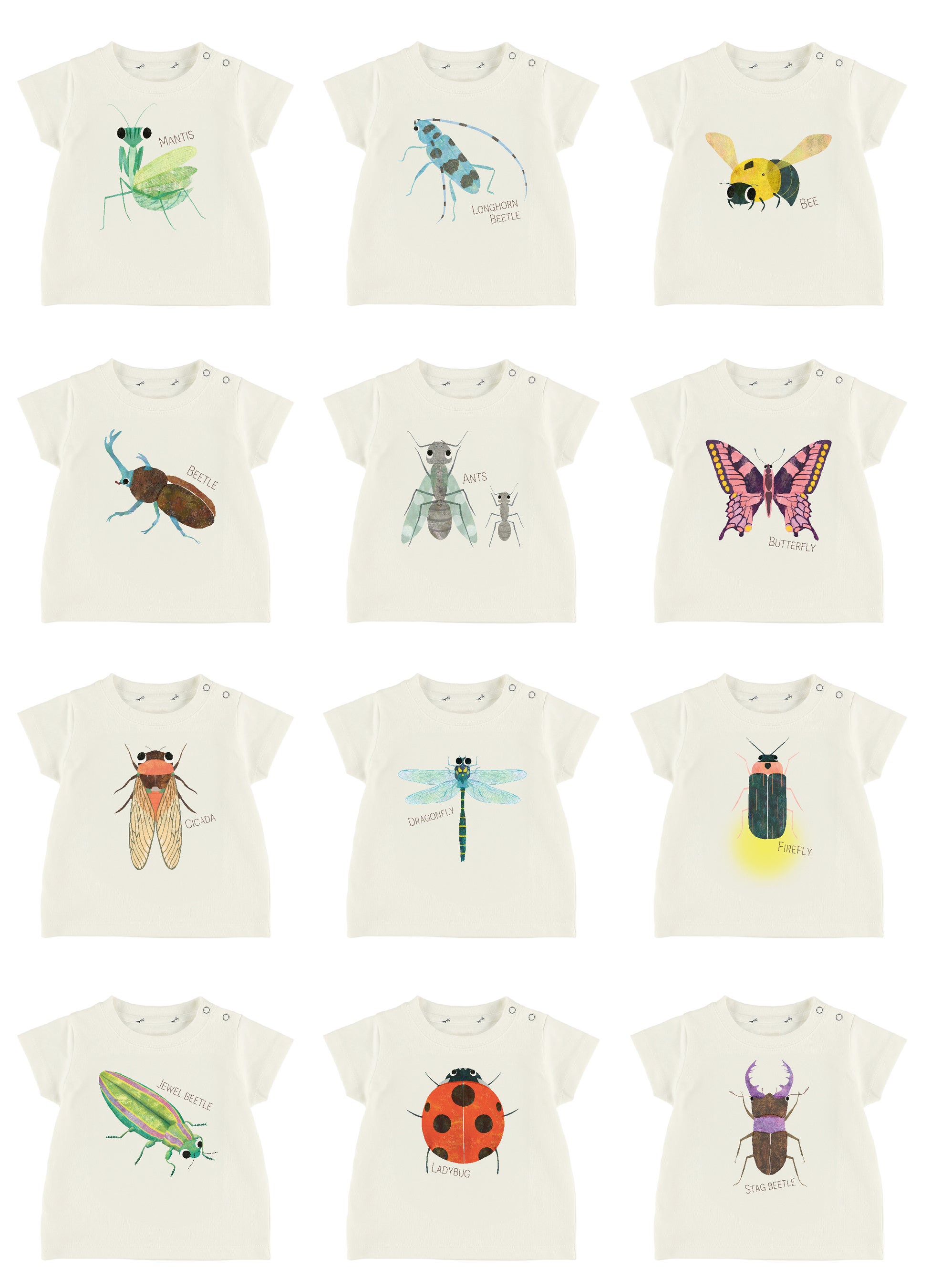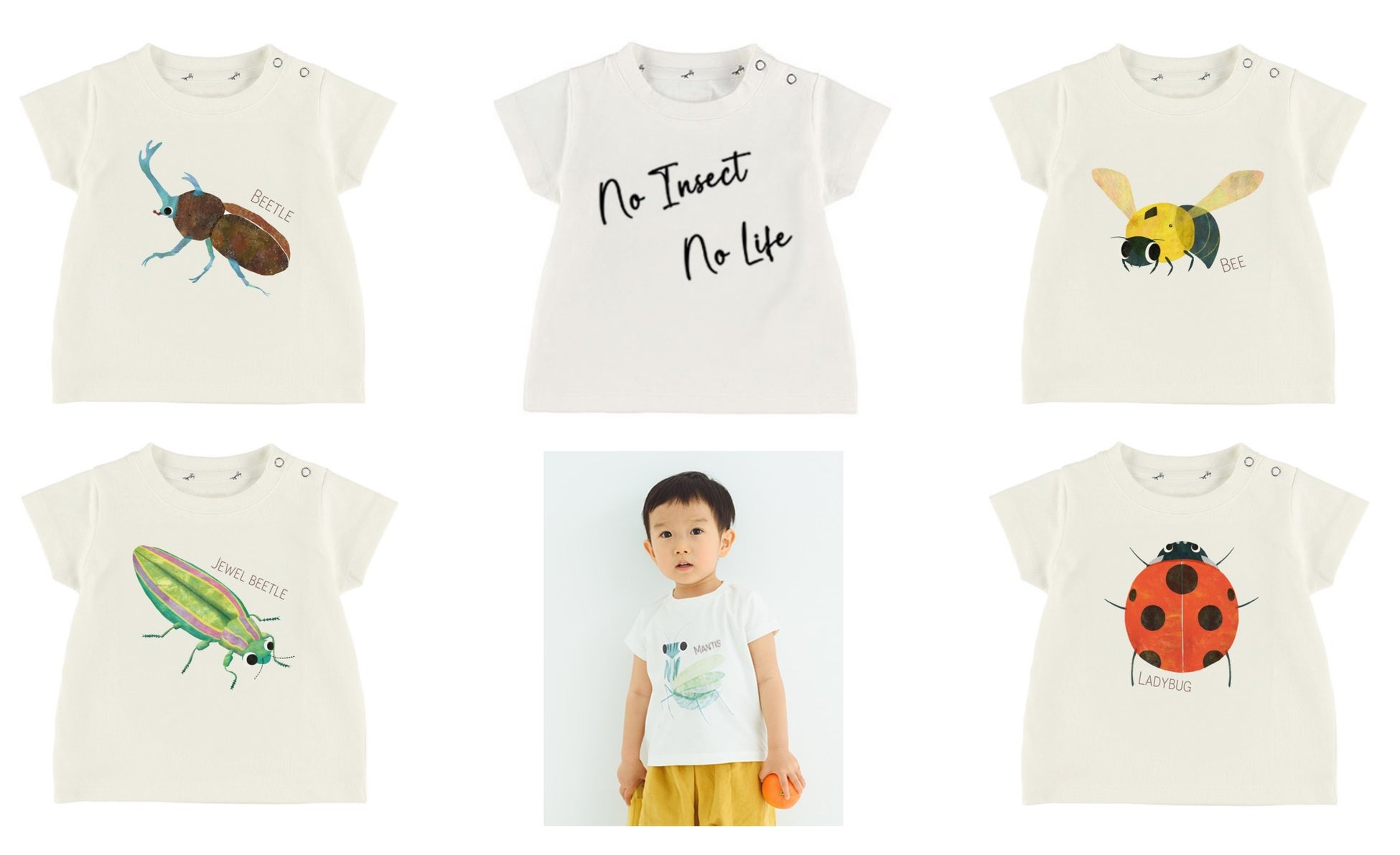 ▲本日より予約販売を開始する12種類の昆虫プリントTシャツ、昆虫なしでは生きられない!No Insect No LifeTシャツ(キッズ各2,500円、大人4,500円・税込み)