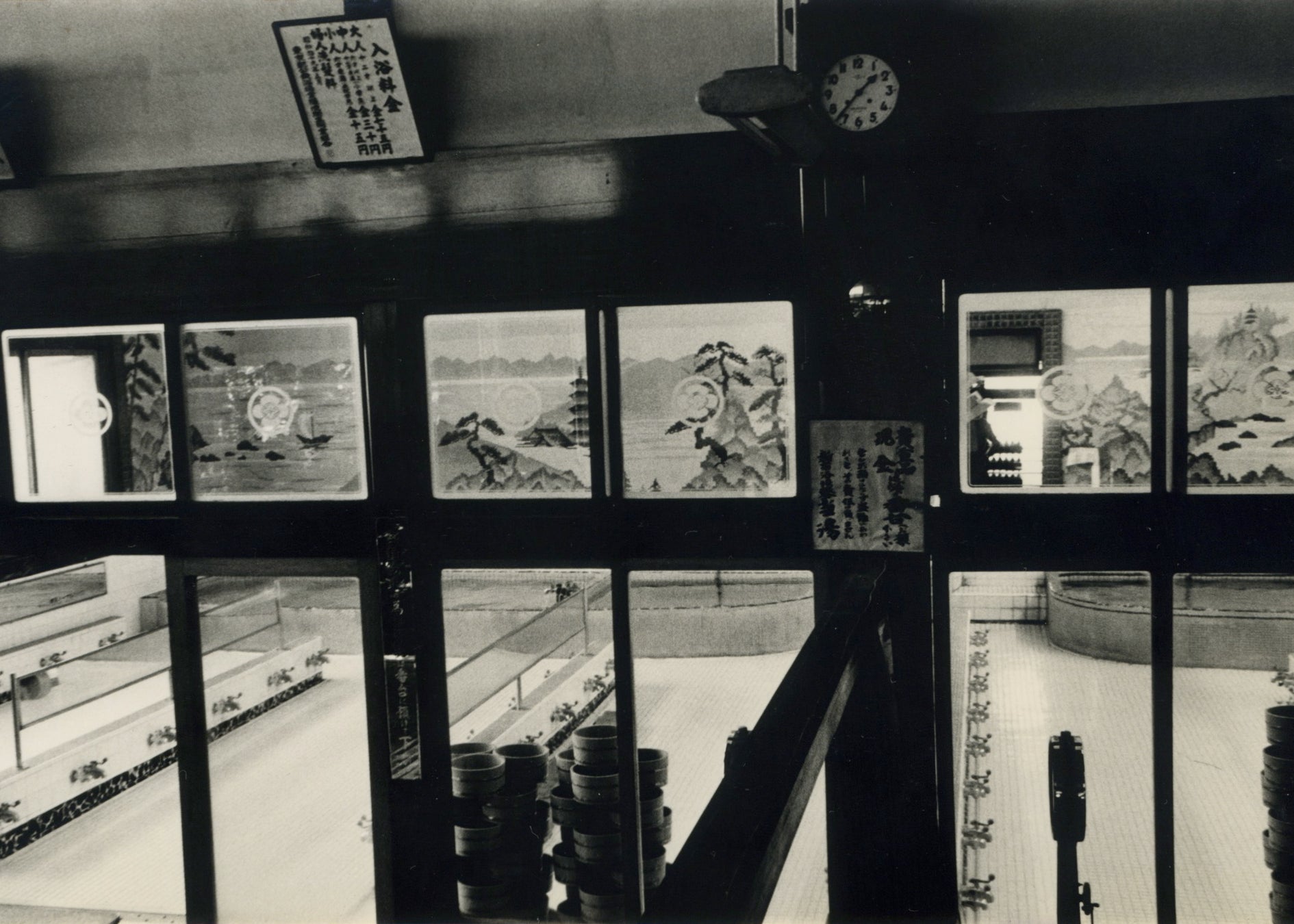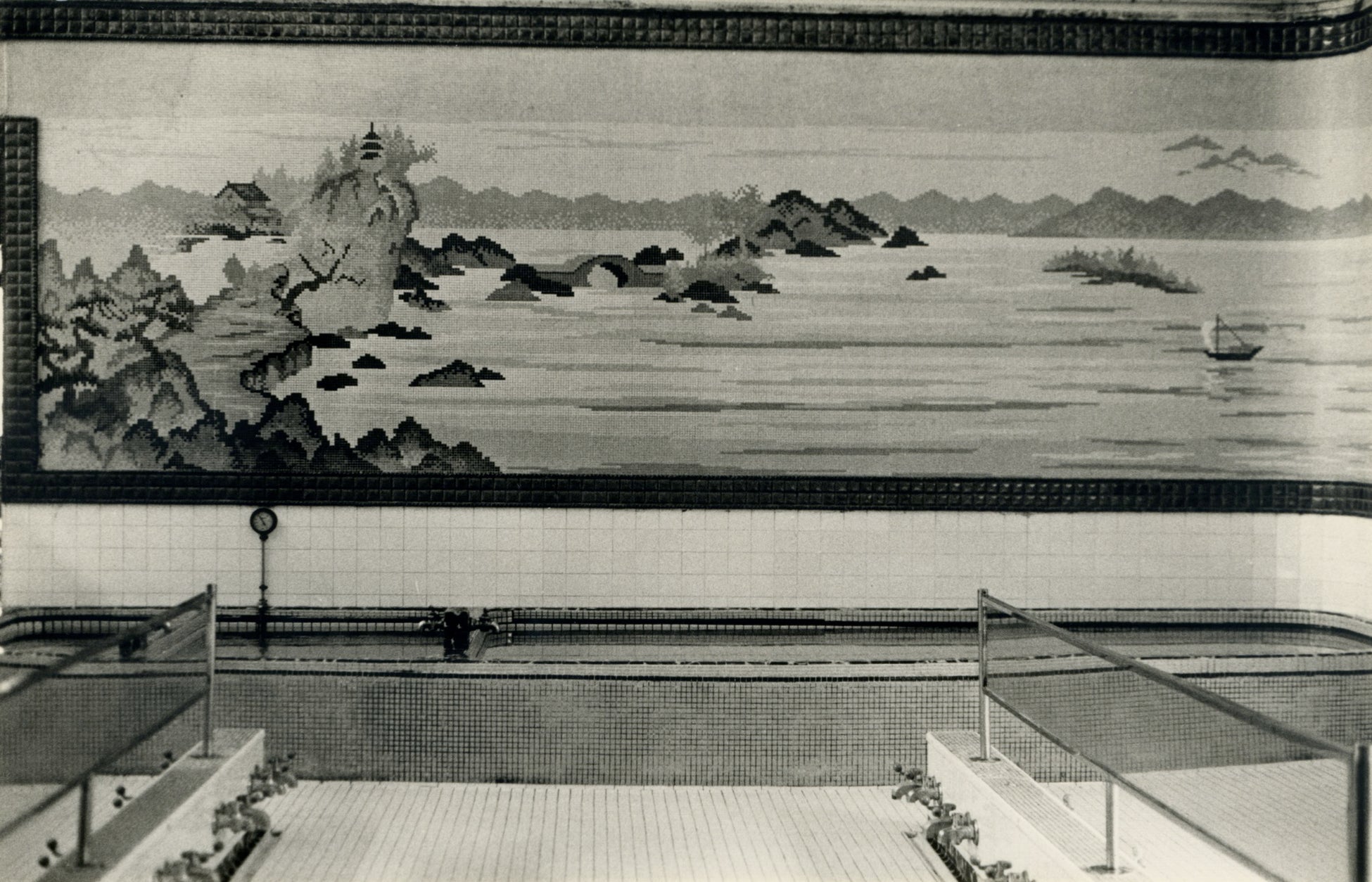 数ある写真の中でも、私の目を引いたのが浴室全面に施された壮大なモザイク壁画でした。それは、日本風とも中国風とも取れるような形容し難い絵図ではありますが、富士山の絵が主流であろう現代の銭湯壁画と比べると私の目には新鮮に映りました。