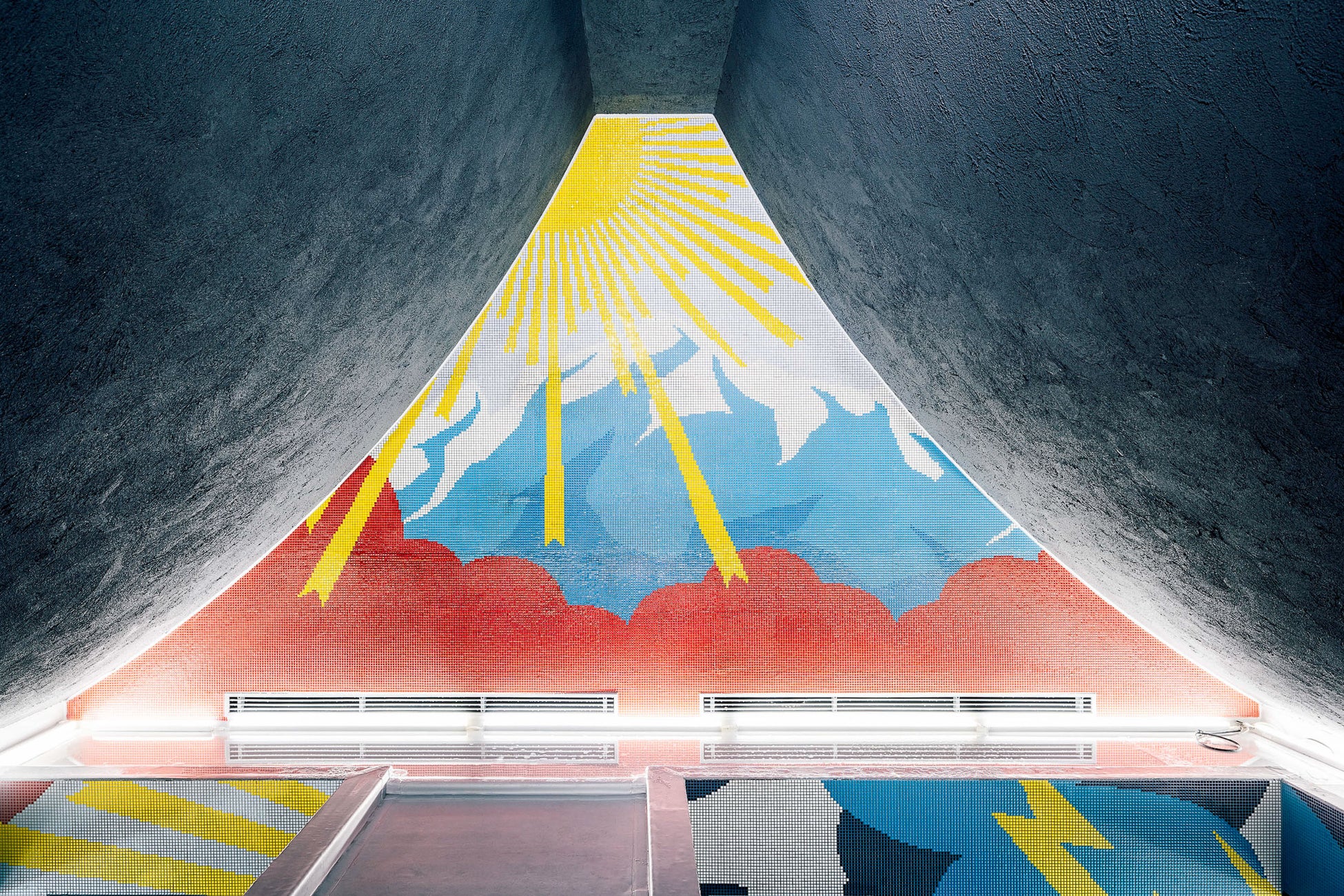 舘鼻則孝が手掛けた「スパ・バルナージュ」の浴室を彩るアートワークは、1センチ角のセラミック製タイルを無数に配置することで完成されたモザイク壁画です。舘鼻の代表的な絵画シリーズ《Descending Painting》を起点として、本作には施設から実際に眺望することができる立山連峰の景色が描かれています。