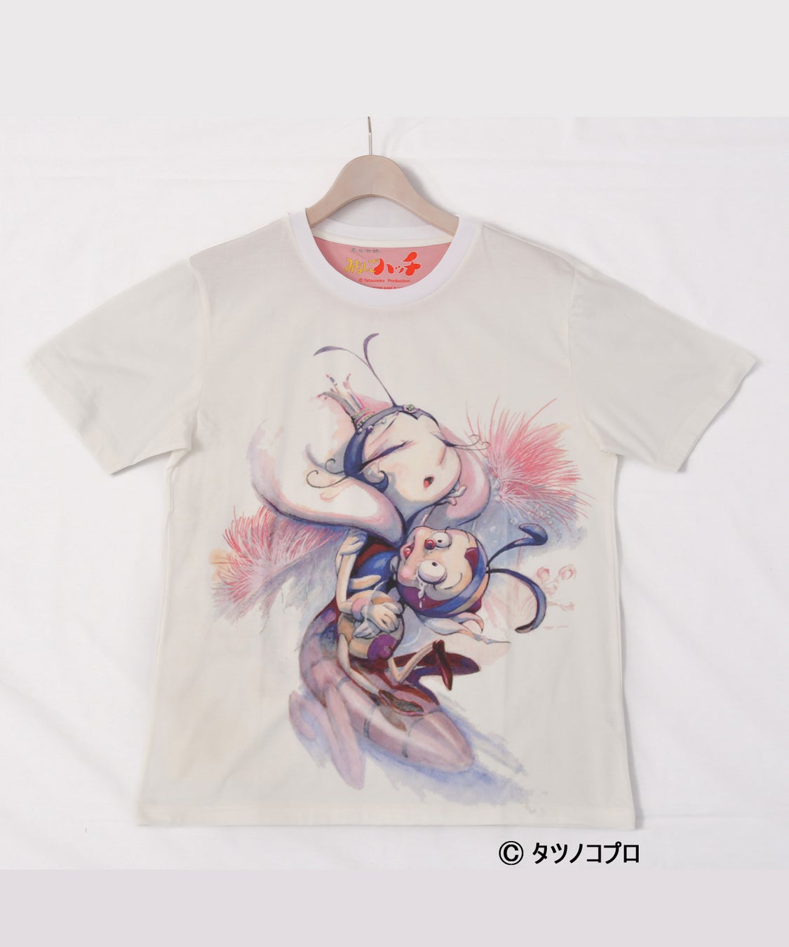 鉛筆画の様なやさしいタッチが特徴的な1枚。背裏(首元の裏)には作品タイトルのロゴがプリントされており、脱いだ時に見える細部もこだわりのポイントです。