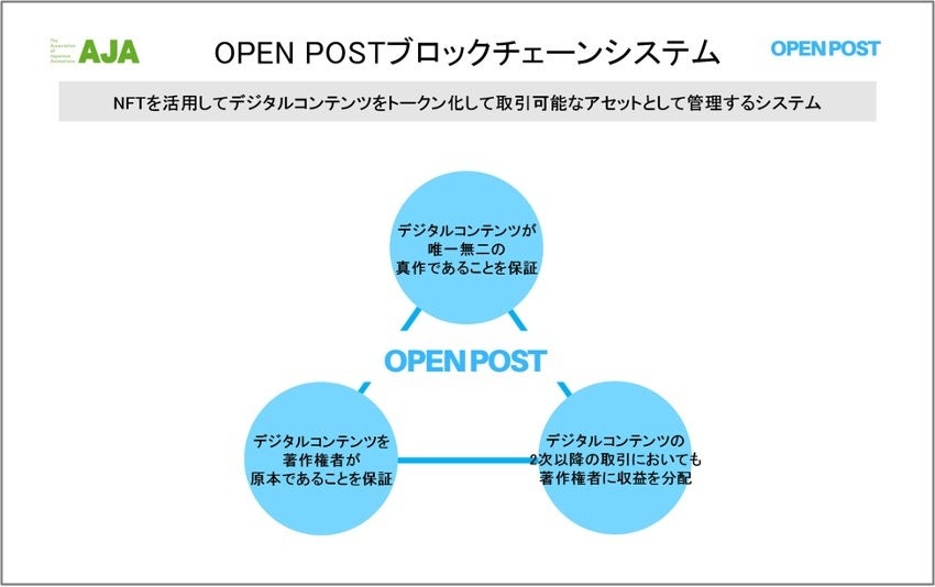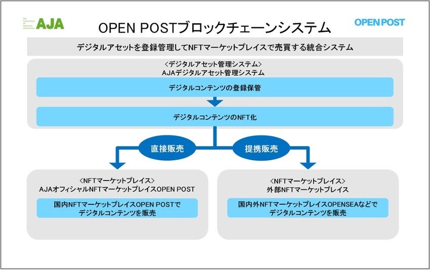 AJAから公認を受け、オープンポスト合同会社(以下OPEN POST、代表社員 小泉満)が運営する、“AJAデジタルアセット管理システム”と“AJAオフィシャルNFTマーケットプレイス”は AJAの正会員・準会員が利用できるシステムで、“AJAデジタルアセット管理システム”は中間生成物から完成原版までデジタルアセットの制作工程をNFT認証をつけて管理保管する倉庫機能を、“AJAオフィシャルNFTマーケットプレイス”はデジタルアセットにNFTを付与して一般消費者に販売するマーケットプレイス機能を実装しています。