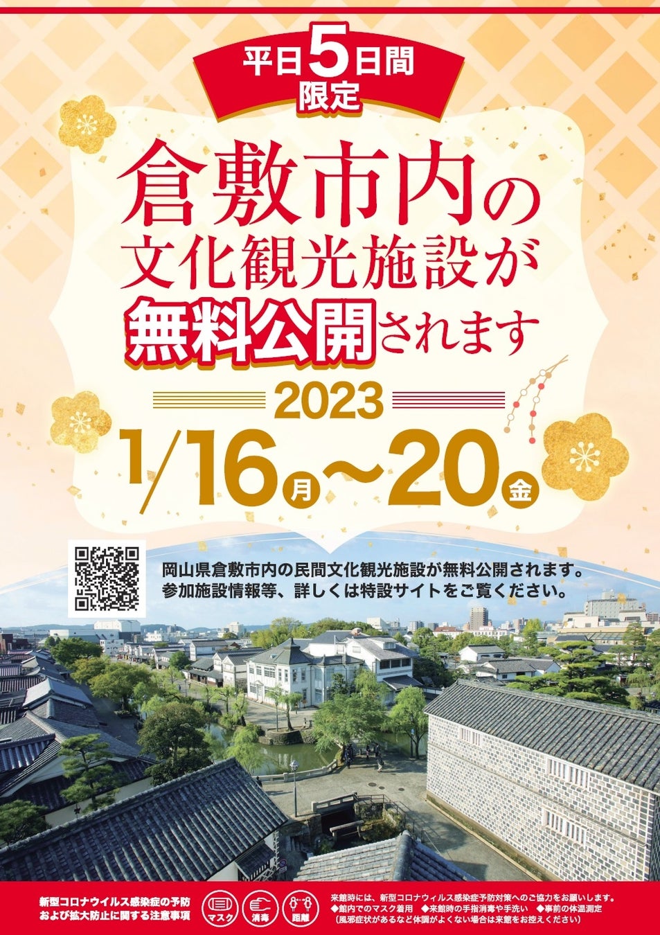 倉敷市は、冬季の市内観光を盛り上げるため、2023年1月16日(月)〜1月20日(金)の平日5日間限定で、市内12か所の民間文化観光施設を無料公開します。
