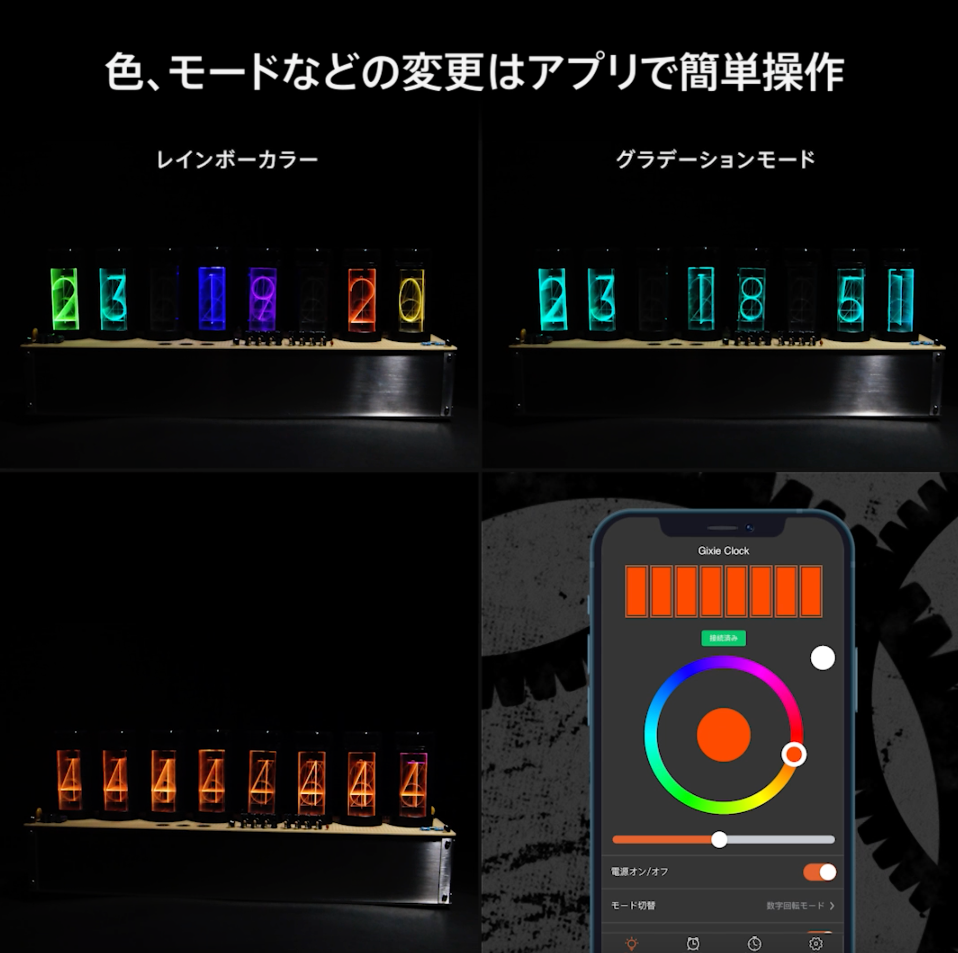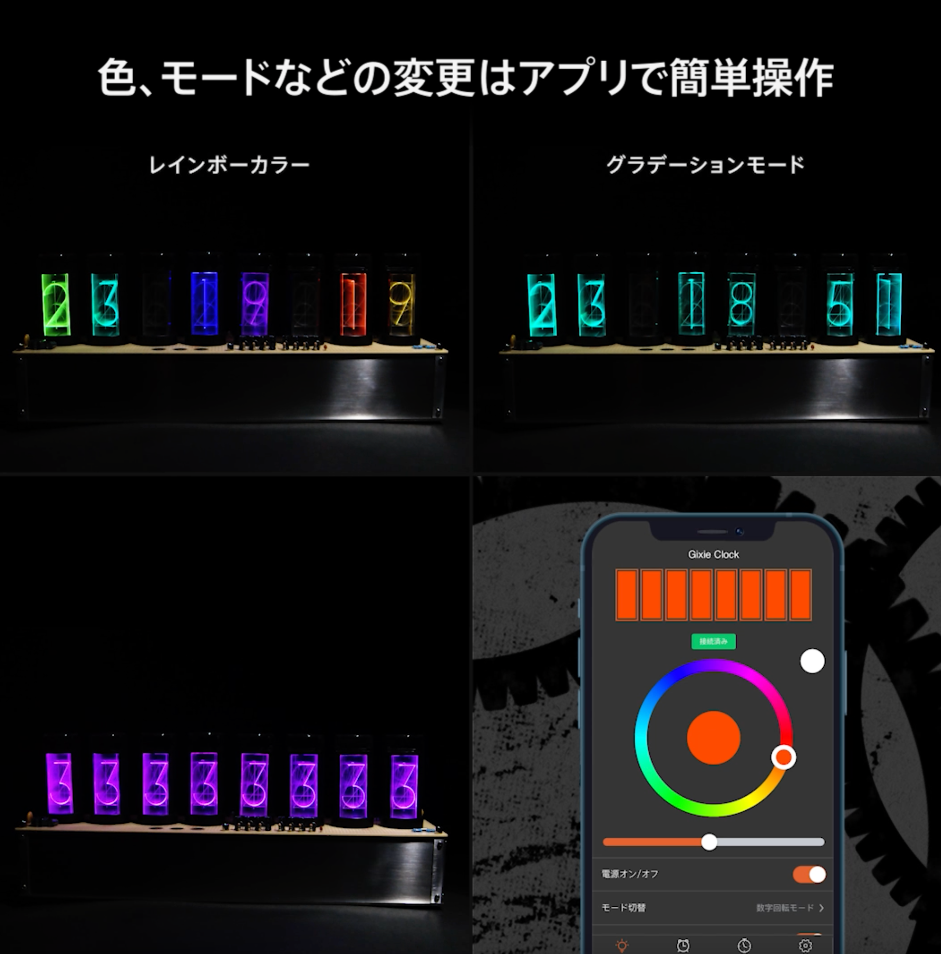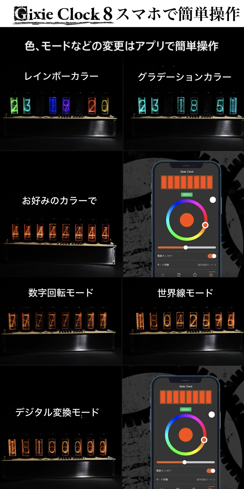 Gixie Clock起案の原点である 8チューブモデル登場!あなただけのオリジナル世界線を作ってみませんか?Wi-Fi接続でアプリ操作、またはタッチパネルでカラー、モード変換可能、アラーム機能も