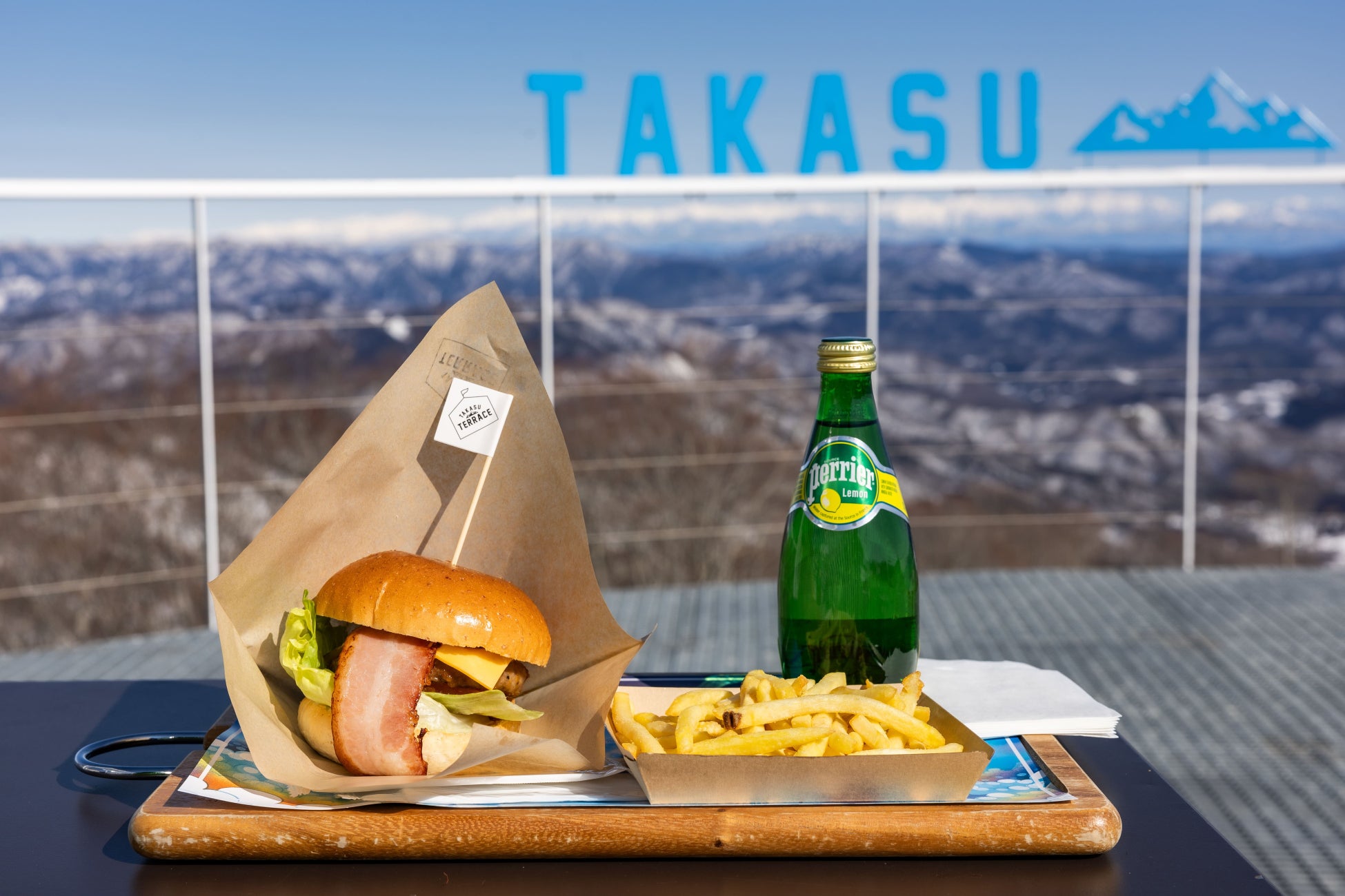標高1550mのゲレンデ山頂にある【TAKASU TERRACE】の店舗イチオシは「ビーチバーガー」。地元企業が監修したパティは飛騨牛入りで味わい深くかつボリューム満点。