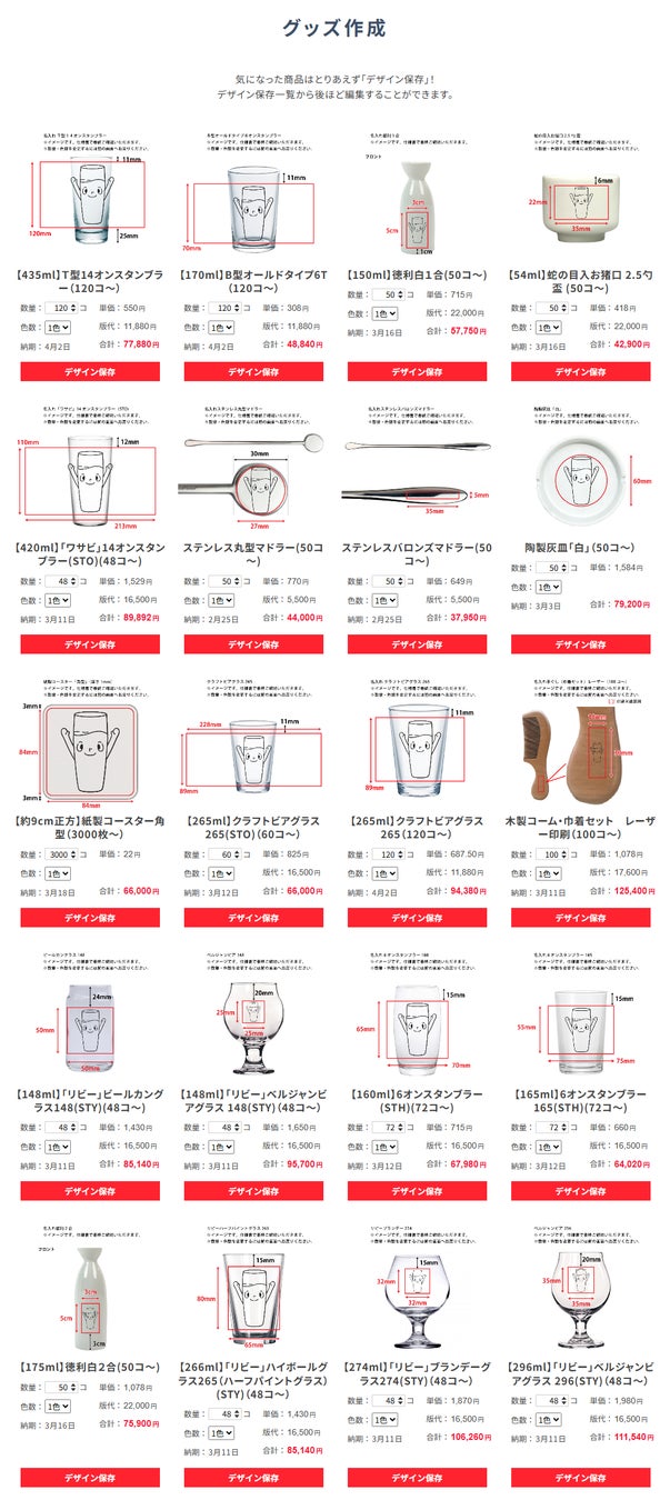 普段は選ばないような珍しい商品も含めて自動でレコメンドされ、過去に作成したオリジナルグッズとは異なる雰囲気の商品を一目で比較できるようになります。