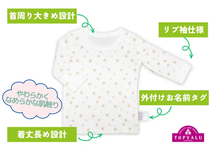 ① お着替えさせやすいけど、重ね着で下から肌着が出ない!「首周り大きめ設計」