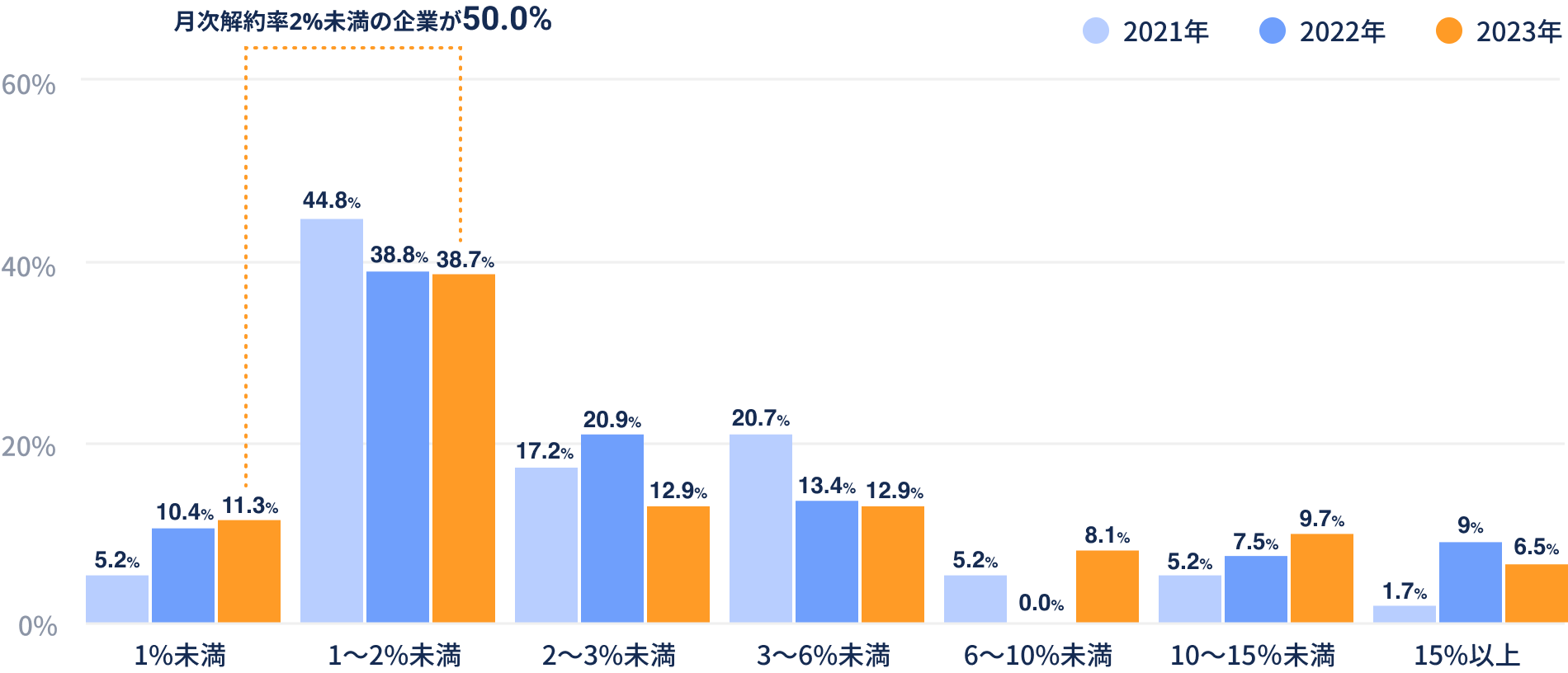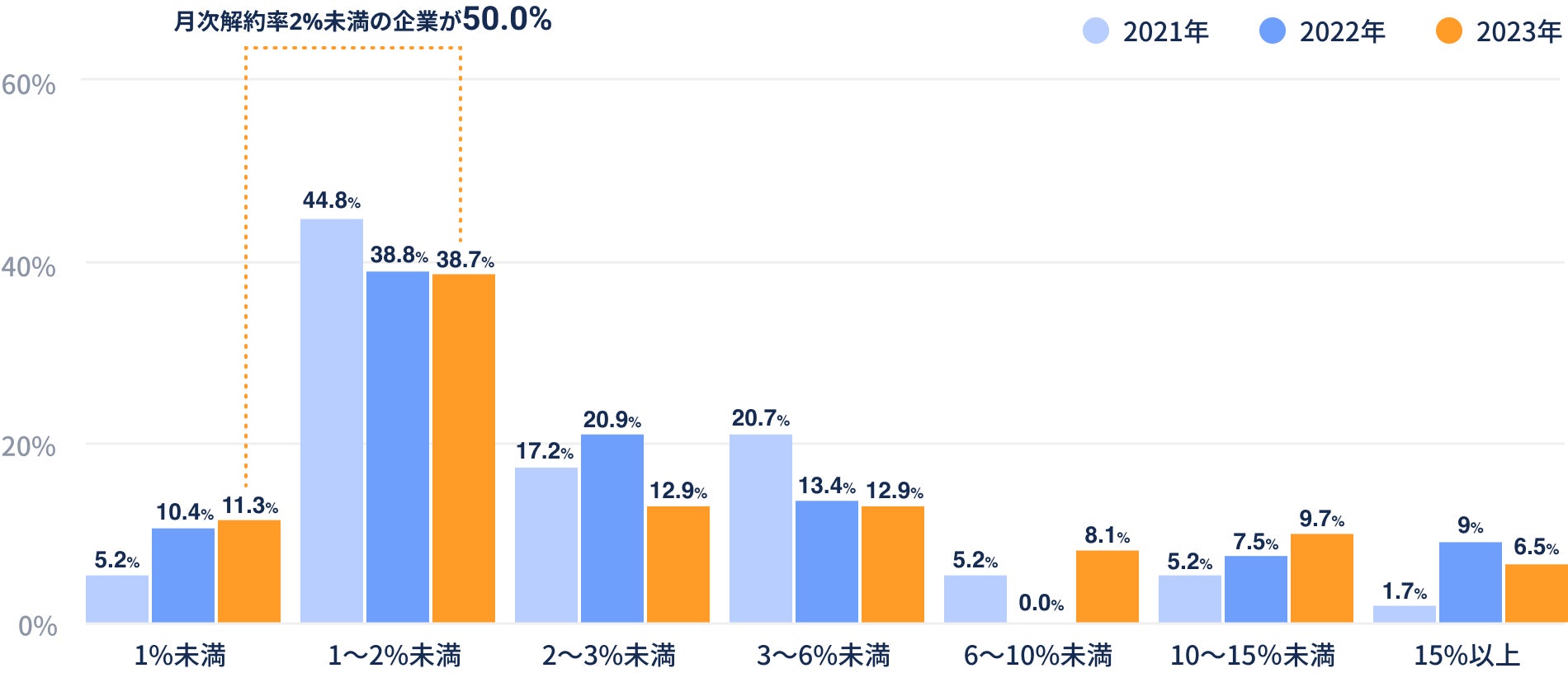 月次解約率2%未満の企業が50.0%と半数以上を占めています。