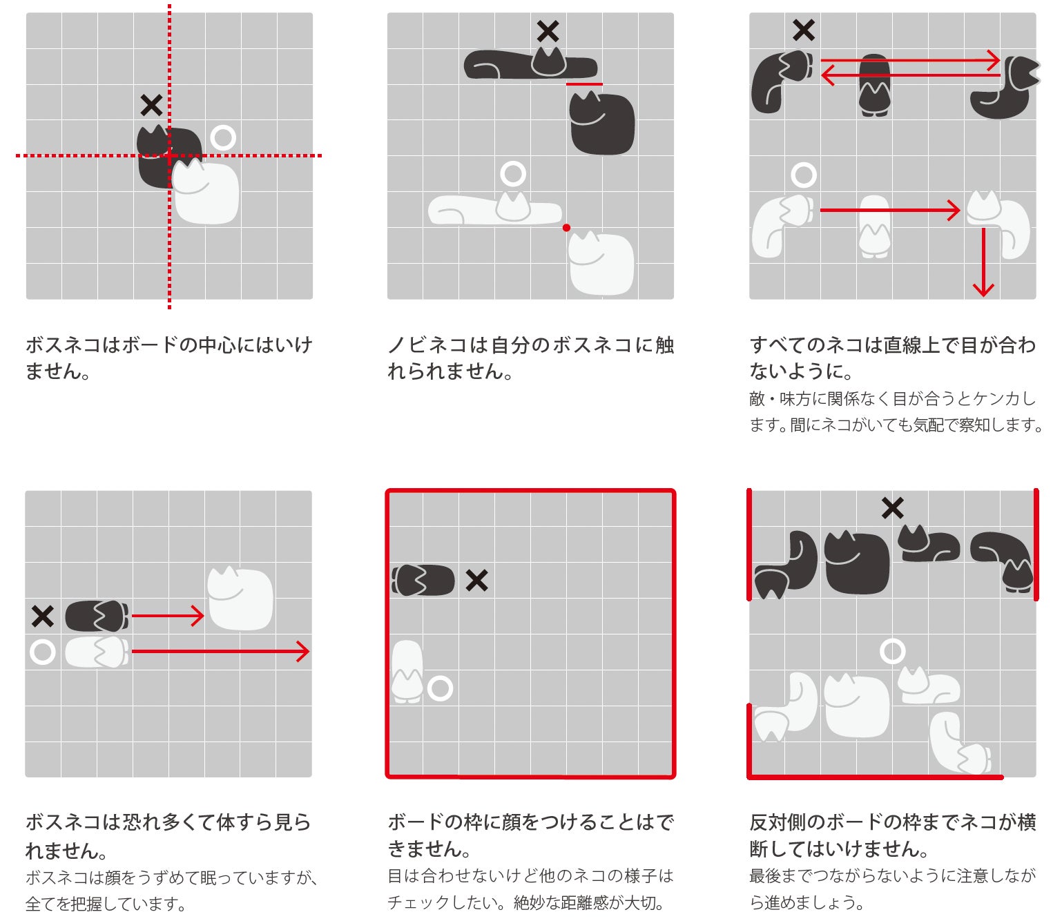白と黒の駒を交互にボードに置いていき、ボードに陣取ったネコの面積*が広い方が勝ち。相手のネコに囲まれないように注意しながら、ボードの上をネコでいっぱいにしましょう。 ゲーム終盤はお互いのネコが猫団子のようにぎゅうぎゅうに集まる姿を見て癒されてください。(*ネコの体をマス目に換算した面積)