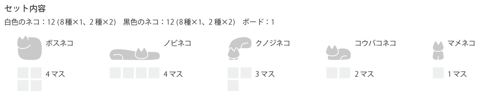 マス目のついたボードに、様々なポーズをしたネコの駒を交互に置いていき、ネコの面積で勝敗を決めるゲームです。