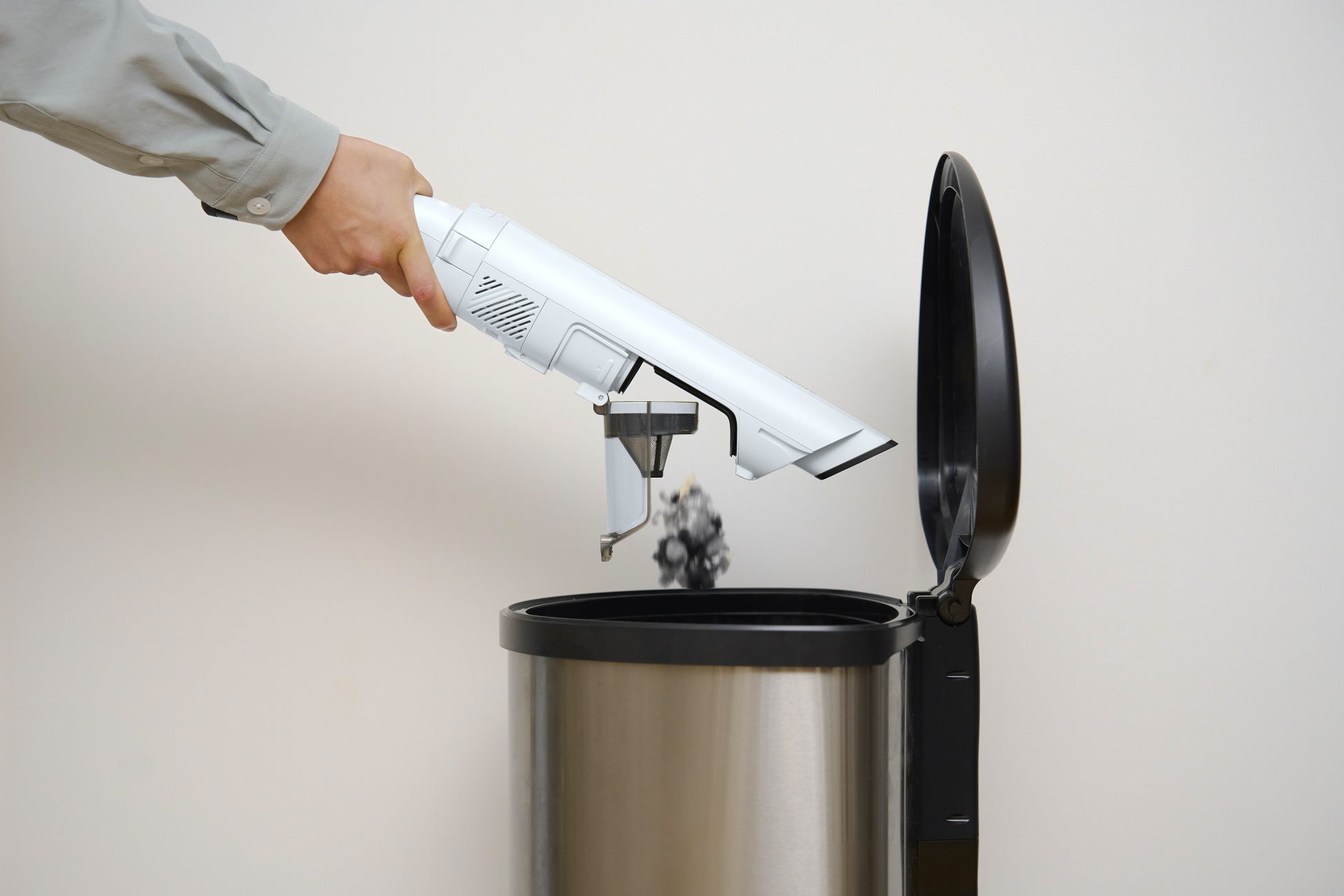 片手でリリースボタンをつまむだけで強力なハンディクリーナーに変身し、家具上や狭い場所のお掃除も、気づいた時にサッと取ってサッと使えます。また、ボタンを押すだけでワンタッチで簡単にゴミ捨ても行えて、ゴミに触らなくていいので衛生的です。
