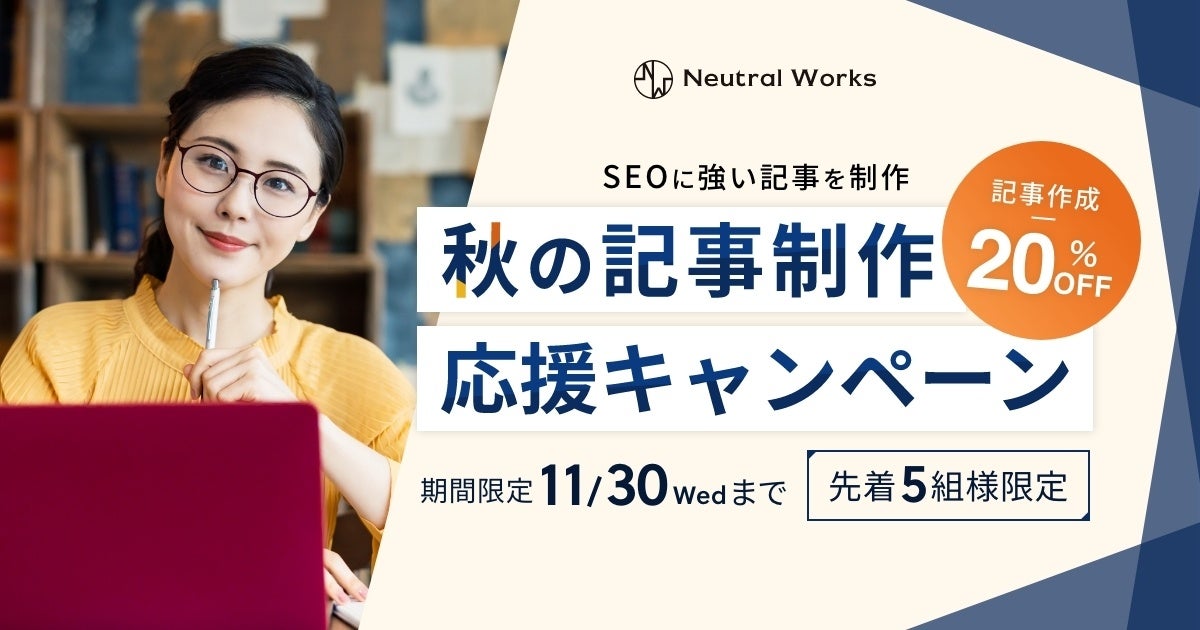 SEOに強みを持つニュートラルワークスが提供する「記事作成代行サービス( https://n-works.link/writing )」を、通常1記事50,000円(税別)のところ、期間限定で20%OFFの40,000円(税別)にてご利用いただけます。先着5組様までとなりますので、お早めにご応募ください。