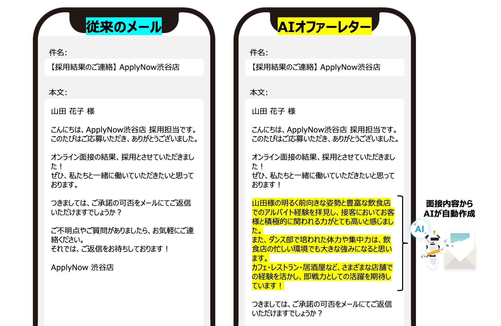 株式会社ApplyNow(本社:東京都渋谷区、代表取締役社長:葛原 昭)が提供するハイブリッドAI面接サービス『Interview Cloud(インタビュークラウド)』は、このたび「AIオファーレター機能」の提供を開始しました。(※1)この新機能は、企業が合格通知をメール送信する際に、AIを活用して個々の応募者に合わせてパーソナライズされたメッセージを自動生成し送信することで、内定承諾率の向上を目指します。