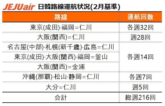 チェジュ航空は東京(成田)·大阪(関西)·福岡·名古屋(中部)など主要幹線都市の他にも、松山·大分·静岡·広島などの地方都市と韓国をつなぐ直航路線を拡大しつつ、韓国旅行に行く日本人旅行客の利便性を高めている。 特に1月12日からは大分=仁川路線を週3回から週5回(月·火·木·金·土)に増やし、広島=仁川路線も週7回から週14回に増便した。