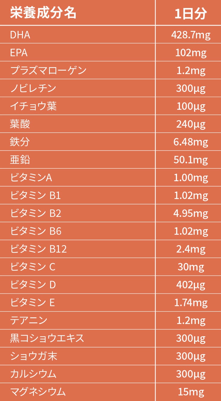 プラズマローゲンには脳疲労を予防、軽減する働きがあり、脳の健康に不可欠な栄養素です。お客様からも「プラズマローゲンの配合量を増やしてほしい」というご要望が多かったため、1.0mg/日から1.2mg/日へ増量いたしました。