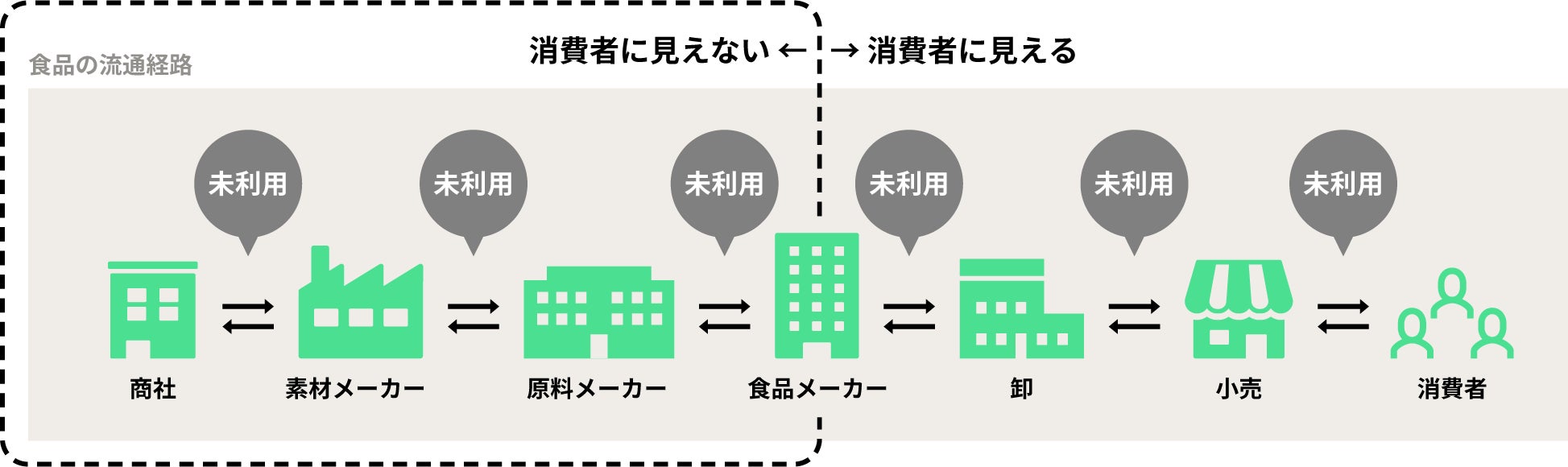 近年、フードロスへの関心は高まり、食品を無駄にしない仕組みが求められています。フードロスの解決は、作りすぎないだけではなく、余剰が発生しても別の形で活用することで実現できるのです。これまで利用されない食品の多くは廃棄されてきました。特に商品になる前の食品原料は外から見えず、救う手段がほとんどありませんでした。そして余っていることの情報が共有されることもありませんでした。