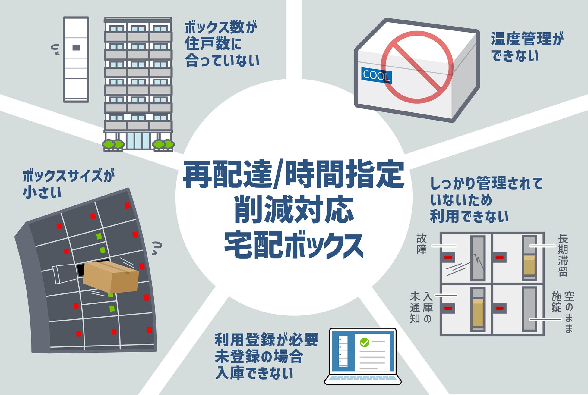 1)ボックス数の不足 2)ボックス容量の不足 3)ボックスの温度管理 4)登録が必要で未登録の場合入庫できない 5)解錠キー・故障等の管理、5つの問題解決に取り組みます。