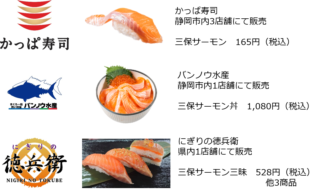 この度、コロワイドグループとして「かっぱ寿司」・「にぎりの徳兵衛」・「バンノウ水産」店舗にて「三保サーモン」を販売することで、バリューチェーンのうち「加工・販売」の側面から、静岡市の新名物のブランド化に貢献してまいります。