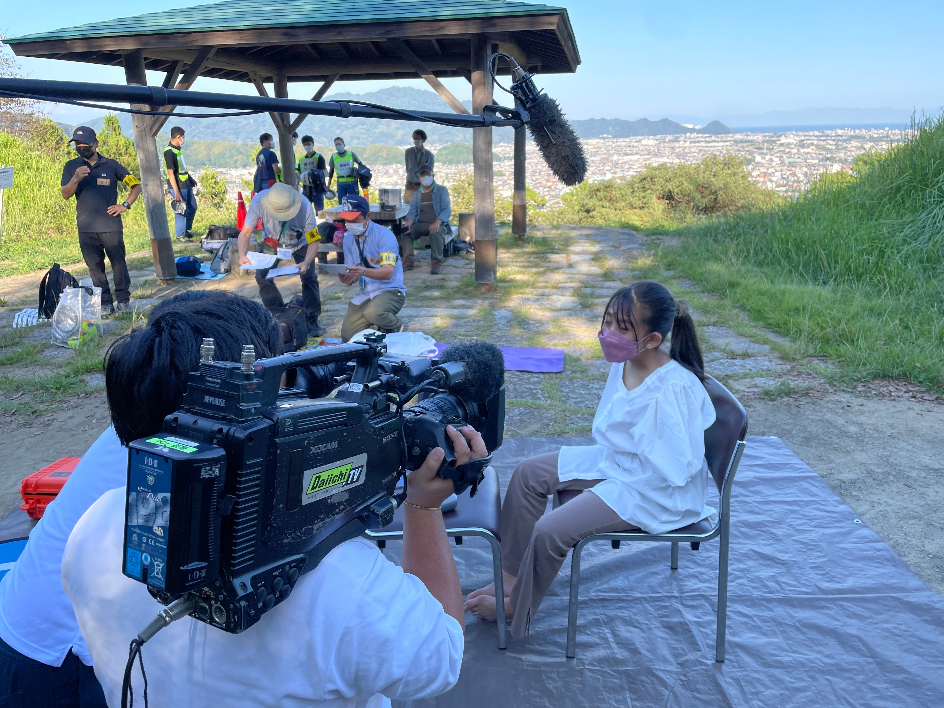 ボランティア活動中の様子。足でドローンを操縦して空撮しました。