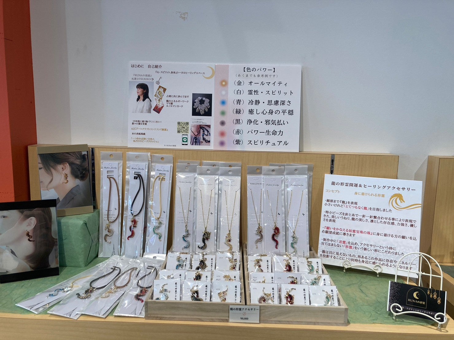 企画者はヒーリングアートスペース「ページェ」代表でカードセッションや講座を主催する光運☆TSUKIKO氏。手作りを15年続けてきた経験とスキルの詰まったモノづくりとスピリチュアルが融合し、存在感のあるアクセサリーに仕上がりました。イヤリング・ピアス・ネックレスの形で、龍のお守りを日常的に身に着けお楽しみいただけます。