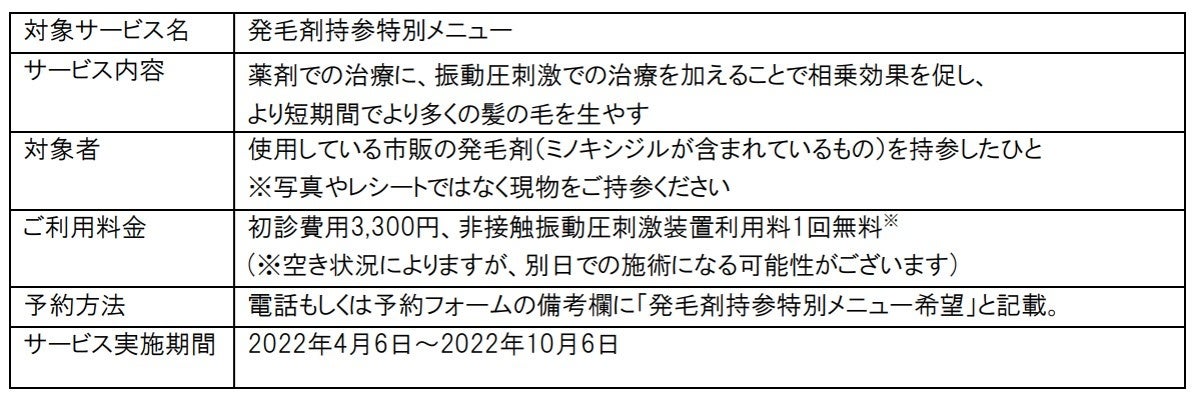 治療を検討している方で、自身が使用している市販の発毛剤(メーカー問わず国内で生産されている、ミノキシジルが含まれているもの)を初診時に持参すると初診費用が3,300円となり、ミノキシジルの効果を促進する日本初技術を搭載した「非接触振動圧刺激装置」による施術をサービス実施期間中、無料で受けることができます。
